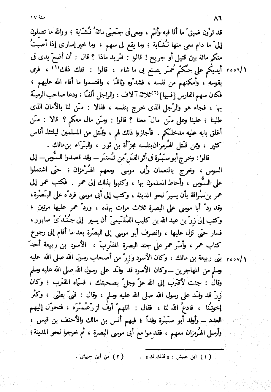 قد ترون ضيق ما أنا فيه وأنتم، ومعى في جعبتى مائه نشابه، والله ما تصلون إلي ما دام معي منها نشابه، وما يقع لي سهم، وما خير إساري إذا أصبت منكم مائة بين قتيل أو جريح! قالوا: فتريد ماذا؟ قال: أن أضع يدي في أيديكم على حكم عمر يصنع بي ما شاء، قالوا: فلك ذلك، فرمى بقوسه، وأمكنهم من نفسه، فشدوه وثاقا، واقتسموا ما أفاء اللَّه عليهم، فكان سهم الفارس فيها ثلاثة آلاف، والراجل ألفا، ودعا صاحب الرمية بها، فجاء هو والرجل الذي خرج بنفسه، فقالا: من لنا بالأمان الذي طلبنا، علينا وعلى من مال معنا؟ قالوا: ومن مال معكم؟ قالا: من أغلق بابه عليه مدخلكم فأجازوا ذلك لهم، وقتل من المسلمين ليلتئذ أناس كثير، وممن قتل الهرمزان بنفسه مجزأة بْن ثور، والبراء بْن مالك.