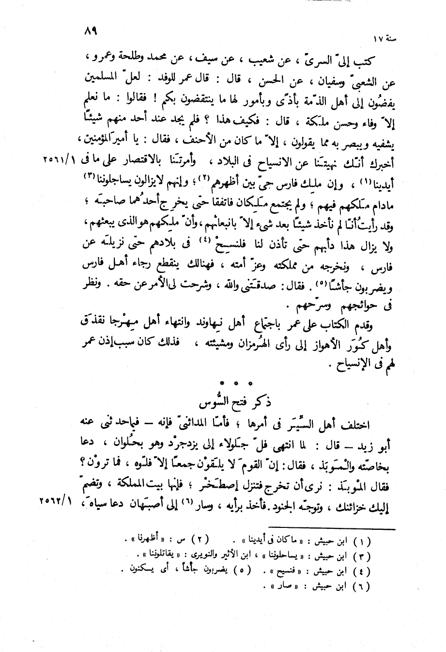 كتب إلي السري، عن شعيب، عن سيف، عن محمد وطلحه وعمرو، عن الشعبى وسفيان، عن الحسن، قال: قال عمر للوفد: لعل المسلمين يفضون إلى أهل الذمة بأذى وبأمور لها ما ينتقضون بكم! فقالوا: ما نعلم إلا وفاء وحسن ملكة، قال: فكيف هذا؟ فلم يجد عند أحد منهم شيئا يشفيه ويبصر به مما يقولون، إلا ما كان من الأحنف، فقال: يا أمير المؤمنين، أخبرك أنك نهيتنا عن الانسياح في البلاد، وأمرتنا بالاقتصار على ما في أيدينا، وإن ملك فارس حي بين أظهرهم، وإنهم لا يزالون يساجلوننا ما دام ملكهم فيهم، ولم يجتمع ملكان فاتفقا حتى يخرج أحدهما صاحبه، وقد رأيت أنا لم نأخذ شيئا بعد شيء إلا بانبعاثهم، وأن ملكهم هو الذي يبعثهم، ولا يزال هذا دأبهم حتى تأذن لنا فلنسح في بلادهم حتى نزيله عن فارس، ونخرجه من مملكته وعز أمته، فهنالك ينقطع رجاء أهل فارس ويضربون جأشا فقال: صدقتني والله، وشرحت لي الأمر عن حقه ونظر في حوائجهم وسرحهم.