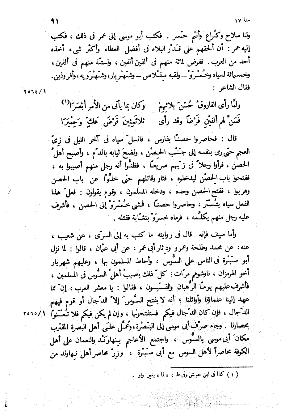 ولنا سلاح وكراع وأنتم حسر فكتب أبو موسى إلى عمر في ذلك، فكتب إليه عمر: أن ألحقهم على قدر البلاء في أفضل العطاء وأكثر شيء أخذه أحد من العرب ففرض لمائة منهم في ألفين ألفين، ولستة منهم في الفين، وخمسمائة لسياه وخسرو- ولقبه مقلاص- وشهريار، وشهرويه، وأفروذين فقال الشاعر: