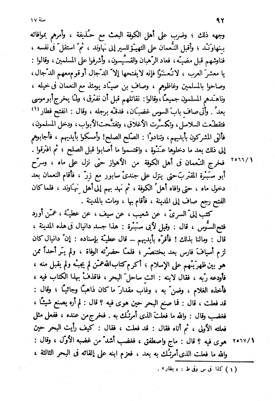 كَتَبَ إِلَيَّ السري، عن شعيب، عن سيف، عن عطية، عمن أورد فتح السوس، قال: وقيل لأبي سبرة: هذا جسد دانيال في هذه المدينة، قال: وما لنا بذلك! فأقره بأيديهم- قال عطية بإسناده: إن دانيال كان لزم أسياف فارس بعد بختنصر، فلما حضرته الوفاة، ولم ير أحدا ممن هو بين ظهريهم على الإسلام، أكرم كتاب اللَّه عمن لم يجبه ولم يقبل منه، فأودعه ربه، فقال لابنه: ائت ساحل البحر، فاقذف بهذا الكتاب فيه، فأخذه الغلام، وضن به، وغاب مقدار ما كان ذاهبا وجائيا، وقال: