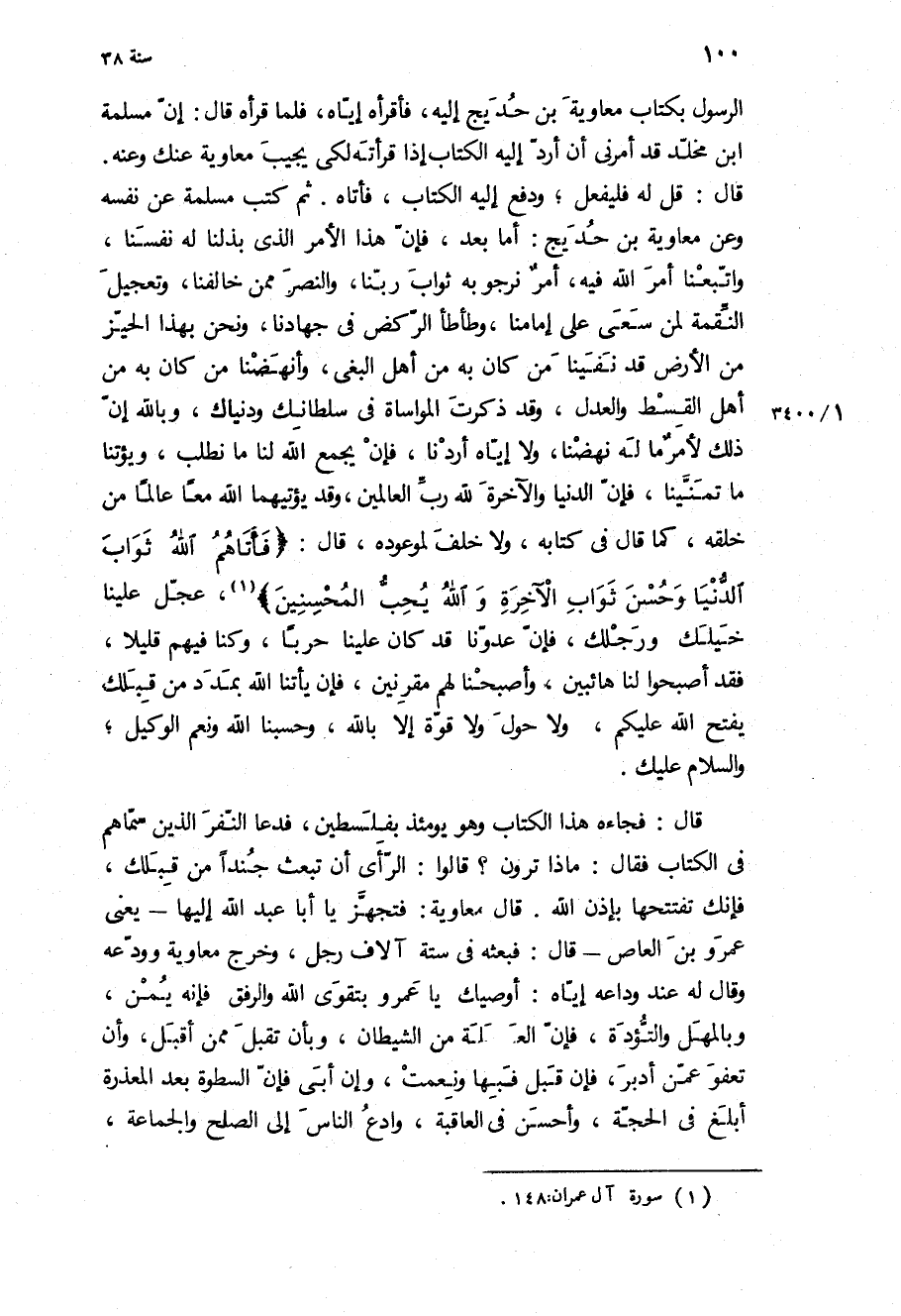 الرسول بكتاب مُعَاوِيَة بن حديج إِلَيْهِ، فأقرأه اياه، فلما قراه قال: ان مسلمه ابن مخلد قد أمرني ان اراد إِلَيْهِ الكتاب إذا قرأته لكي يجيب مُعَاوِيَة عنك وعنه قَالَ: قل لَهُ فليفعل، ودفع إِلَيْهِ الكتاب، فأتاه ثُمَّ كتب مسلمة عن نفسه وعن مُعَاوِيَة بن حديج: أَمَّا بَعْدُ، فان هذا الأمر الذى بذلنا له نفسنا، واتبعنا أمر اللَّه فِيهِ، أمر نرجو بِهِ ثواب ربنا، والنصر ممن خالفنا، وتعجيل النقمة لمن سعى عَلَى إمامنا، وطأطأ الركض فِي جهادنا، ونحن بهذا الحيز من الأرض قَدْ نفينا من كَانَ بِهِ من أهل البغي، وأنهضنا من كَانَ بِهِ من أهل القسط والعدل، وَقَدْ ذكرت المواساة فِي سلطانك ودنياك، وبالله إن ذَلِكَ لأمر مَا لَهُ نهضنا، وَلا إِيَّاهُ أردنا، فإن يجمع اللَّه لنا مَا نطلب، ويؤتنا مَا تمنينا، فإن الدُّنْيَا والآخرة لِلَّهِ رب العالمين، وَقَدْ يؤتيهما اللَّه معا عالما من خلقه، كما قَالَ فِي كتابه، وَلا خلف لموعوده، قَالَ: «فَآتاهُمُ اللَّهُ ثَوابَ الدُّنْيا وَحُسْنَ ثَوابِ الْآخِرَةِ وَاللَّهُ يُحِبُّ الْمُحْسِنِينَ» ، عجل علينا خيلك ورجلك، فإن عدونا قَدْ كَانَ علينا حربا، وكنا فِيهِمْ قليلا، فقد أصبحوا لنا هائبين، وأصبحنا لَهُمْ مقرنين، فإن يأتنا اللَّه بمدد من قبلك يفتح اللَّه عَلَيْكُمْ، وَلا حول وَلا قوة إلا بِاللَّهِ، وحَسْبُنَا اللَّهُ وَنِعْمَ الْوَكِيلُ، والسلام عَلَيْك قَالَ: فجاءه هَذَا الكتاب وَهُوَ يَوْمَئِذٍ بفلسطين، فدعا النفر الَّذِينَ سماهم فِي الكتاب فَقَالَ: ماذا ترون؟ قَالُوا: الرأي أن تبعث جندا من قبلك، فإنك تفتتحها بإذن اللَّه قَالَ مُعَاوِيَة: فتجهز يَا أَبَا عَبْد اللَّهِ إِلَيْهَا- يعني عَمْرو بن الْعَاصِ- قَالَ: فبعثه فِي ستة آلاف رجل، وخرج مُعَاوِيَة وودعه وَقَالَ لَهُ عِنْدَ وداعه إِيَّاهُ: أوصيك يَا عَمْرو بتقوى الله والرفق فانه يمن، وبالمهل والتوؤده، فإن العجلة من الشَّيْطَان، وبأن تقبل ممن أقبل، وأن تعفو عمن أدبر، فإن قبل فبها ونعمت، وإن أبى فإن السطوة بعد المعذرة أبلغ فِي الحجة، وأحسن فِي العاقبة، وادع الناس إِلَى الصلح والجماعة،