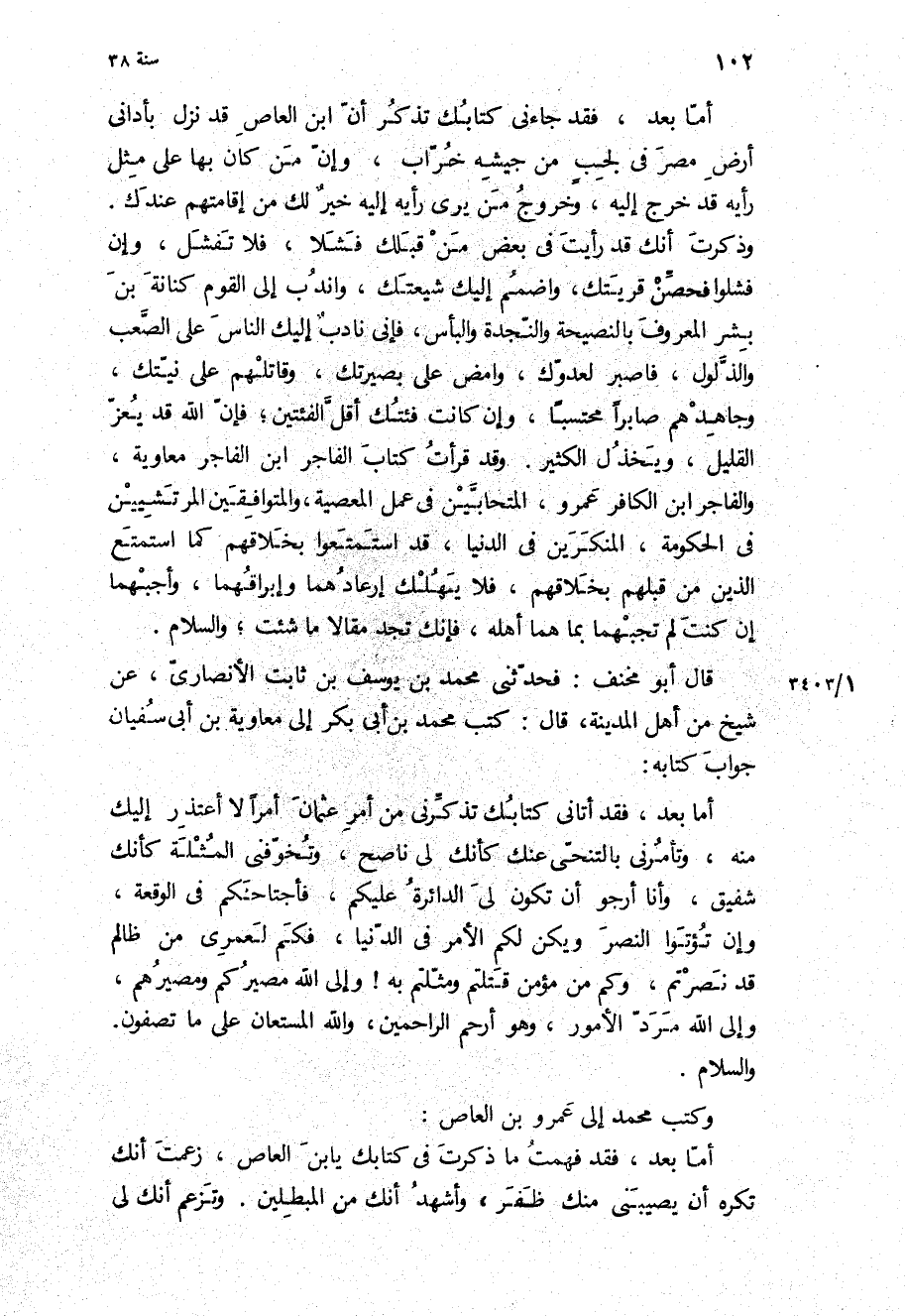 أَمَّا بَعْدُ، فقد فهمت مَا ذكرت في كتابك يا بن العاص، زعمت أنك تكره أن يصيبني مِنْكَ ظفر، وأشهد أنك من المبطلين وتزعم أنك لي