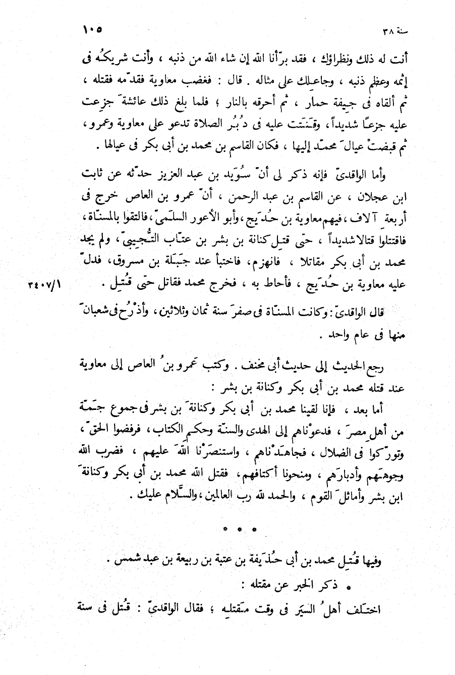 وأما الْوَاقِدِيّ فإنه ذكر لي أن سويد بن عَبْدِ الْعَزِيزِ حدثه عن ثابت ابن عجلان، عَنِ الْقَاسِمِ بْنِ عبد الرَّحْمَن، أن عَمْرو بن الْعَاصِ خرج فِي أربعة آلاف، فِيهِمْ مُعَاوِيَة بن حديج، وأبو الأعور السلمي، فالتقوا بالمسناة، فاقتتلوا قتالا شديدا، حَتَّى قتل كنانه بن بشر بن عتاب التُّجِيبِيّ، ولم يجد مُحَمَّد بن أبي بكر مقاتلا، فانهزم، فاختبأ عِنْدَ جبلة بن مسروق، فدل عَلَيْهِ مُعَاوِيَة بن حديج، فأحاط بِهِ، فخرج مُحَمَّد فقاتل حَتَّى قتل.