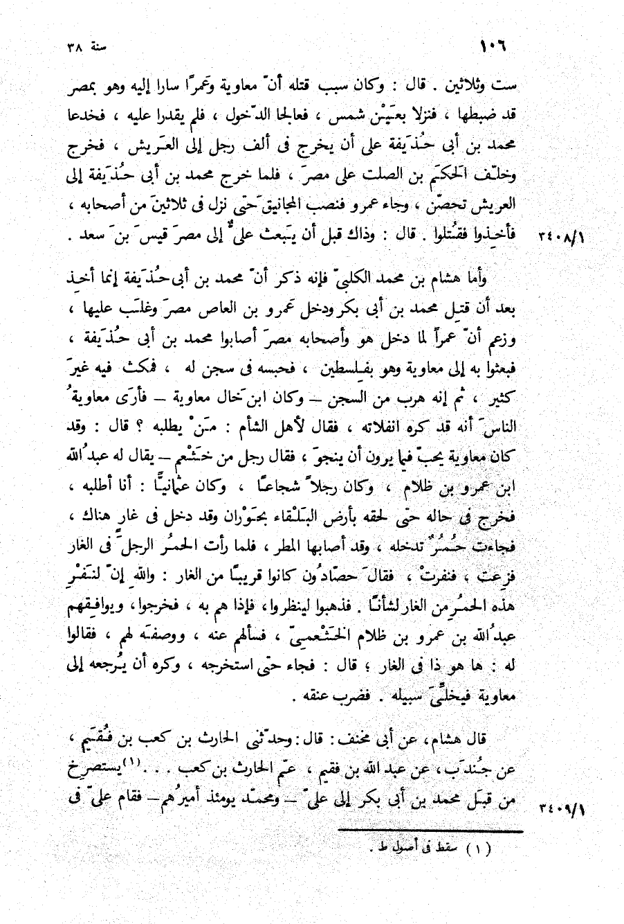 وأما هِشَام بْن مُحَمَّد الكلبي فإنه ذكر أن مُحَمَّد بن أبي حُذَيْفَة إنما أخذ بعد أن قتل مُحَمَّد بن أبي بكر ودخل عَمْرو بن الْعَاصِ مصر وغلب عَلَيْهَا، وزعم أن عمرا لما دخل هُوَ وأَصْحَابه مصر أصابوا مُحَمَّد بن أبي حُذَيْفَة، فبعثوا بِهِ إِلَى مُعَاوِيَةَ وَهُوَ بفلسطين، فحبسه فِي سجن لَهُ، فمكث فِيهِ غير كثير، ثُمَّ إنه هرب من السجن- وَكَانَ ابن خال مُعَاوِيَة- فأرى مُعَاوِيَة الناس أنه قَدْ كره انفلاته، فَقَالَ لأهل الشام: من يطلبه؟ قَالَ: وَقَدْ كَانَ مُعَاوِيَة يحب فِيمَا يرون أن ينجو، فَقَالَ رجل من خثعم- يقال له عبد الله ابن عَمْرو بن ظلام، وَكَانَ رجلا شجاعا، وَكَانَ عثمانيا: أنا أطلبه فخرج فِي حالة حَتَّى لحقه بأرض البلقاء بحوران وَقَدْ دخل فِي غار هُنَاكَ، فجاءت حمر تدخله، وَقَدْ أصابها المطر، فلما رأت الحمر الرجل فِي الغار فزعت، فنفرت، فَقَالَ حصادون كَانُوا قريبا من الغار: وَاللَّهِ إن لنفر هَذِهِ الحمر من الغار لشأنا فذهبوا لينظروا، فإذا هم بِهِ، فخرجوا، ويوافقهم عَبْد اللَّهِ بن عَمْرو بن ظلام الخثعمي، فسألهم عنه، ووصفه لَهُمْ، فَقَالُوا له: ها هو ذا فِي الغار، قَالَ: فَجَاءَ حَتَّى استخرجه، وكره أن يرجعه إِلَى مُعَاوِيَةَ فيخلي سبيله فضرب عنقه قَالَ هِشَام، عن أبي مخنف: قَالَ: وَحَدَّثَنِي الْحَارِث بن كعب بن فقيم، عن جندب، عن عَبْد اللَّهِ بن فقيم، عم الْحَارِث بن كعب يستصرخ من قبل مُحَمَّد بن أبي بكر إِلَى علي- ومُحَمَّد يَوْمَئِذٍ أميرهم- فقام علي فِي