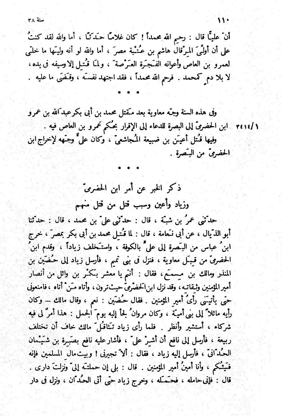 حَدَّثَنِي عُمَرُ بْنُ شَبَّةَ، قَالَ: حَدَّثَنِي عَلِيُّ بْنُ مُحَمَّدٍ، قَالَ: حَدَّثَنَا أَبُو الذَّيَّالِ، عَنْ أَبِي نَعَامَةَ، قَالَ: لَمَّا قُتِلَ مُحَمَّدُ بْنُ أَبِي بَكْرٍ بِمِصْرَ، خَرَجَ ابْنُ عَبَّاسٍ مِنَ الْبَصْرَةِ إِلَى عَلِيٍّ بِالْكُوفَةِ، وَاسْتَخْلَفَ زِيَادًا، وَقَدِمَ ابْنُ الْحَضْرَمِيِّ مِنْ قِبَلِ مُعَاوِيَةَ، فَنَزَلَ فِي بَنِي تَمِيمٍ، فَأَرْسَلَ زِيَادٌ إِلَى حُضَيْنِ بْنِ الْمُنْذِرِ وَمَالِكِ بْنِ مِسْمَعٍ، فَقَالَ: أَنْتُمْ يَا مَعْشَرَ بَكْرِ بْنِ وَائِلٍ مِنْ أَنْصَارِ أَمِيرِ الْمُؤْمِنِينَ وَثِقَاتِهِ، وَقَدْ نَزَلَ ابْنُ الْحَضْرَمِيِّ حَيْثُ تَرَوْنَ، وَأَتَاهُ مَنْ أَتَاهُ، فَامْنَعُونِي حَتَّى يَأْتِيَنِي رَأْيُ أَمِيرِ الْمُؤْمِنِينَ فَقَالَ حضين: نعم، وقال مالك- وكان رايه مائلا إِلَى بَنِي أُمَيَّةَ، وَكَانَ مَرْوَانُ لَجَأَ إِلَيْهِ يَوْمَ الْجَمَلِ: هَذَا أَمْرٌ لِي فِيهِ شُرَكَاءُ، أَسْتَشِيرُ وَأَنْظُرُ فَلَمَّا رَأَى زِيَادٌ تَثَاقُلَ مَالِكٍ خَافَ أَنْ تَخْتَلِفَ رَبِيعَةُ، فَأَرْسَلَ إِلَى نَافِعٍ أَنْ أَشِرْ عَلَيَّ، فَأَشَارَ عَلَيْهِ نَافِعٌ بِصَبْرَةَ بْنِ شَيْمَانَ الْحُدَّانِيِّ، فَأَرْسَلَ إِلَيْهِ زِيَادٌ، فَقَالَ: الا تجيرني! وبيت مال المسلمين فانه فيئكم، وَأَنَا أَمِينُ أَمِيرِ الْمُؤْمِنِينَ قَالَ: بَلَى إِنْ حَمَلْتَهُ إِلَيَّ وَنَزَلْتَ دَارِي.