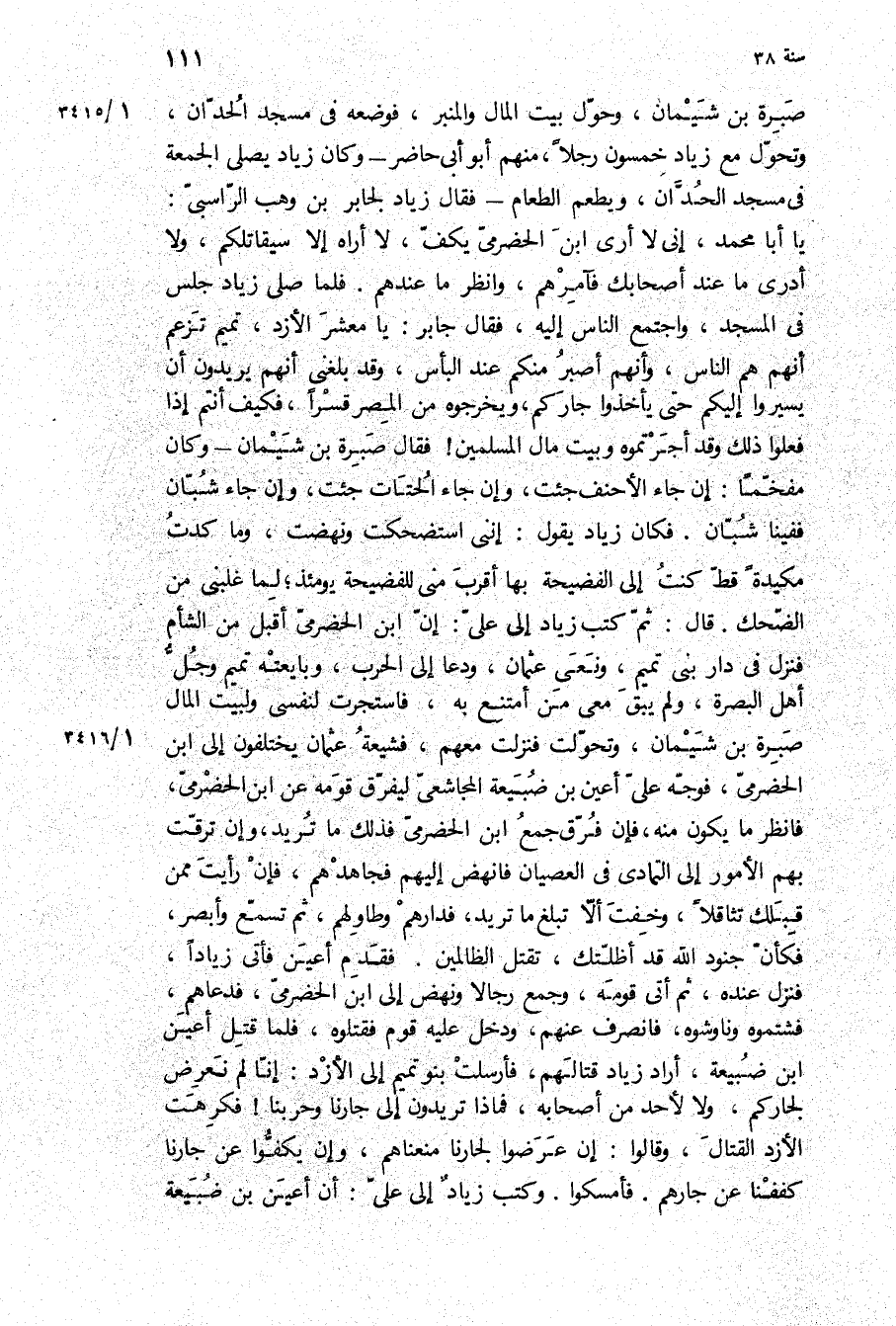 يَا أَبَا مُحَمَّدٍ، إِنِّي لا أَرَى ابْنَ الحضرمى يكف، لا أَرَاهُ إِلا سَيُقَاتِلُكُمْ، وَلا أَدْرِي مَا عِنْدَ أَصْحَابِكَ فَآمِرْهُمْ، وَانْظُرْ مَا عِنْدَهُمْ فَلَمَّا صَلَّى زِيَادٌ جَلَسَ فِي الْمَسْجِدِ، وَاجْتَمَعَ النَّاسُ إِلَيْهِ، فَقَالَ جَابِرٌ: يَا مَعْشَرَ الأَزْدِ، تَمِيمٌ تَزْعُمُ أَنَّهُمْ هُمُ النَّاسُ، وَأَنَّهُمْ أَصْبَرُ مِنْكُمْ عِنْدَ الْبَأْسِ، وَقَدْ بَلَغَنِي أَنَّهُمْ يُرِيدُونَ أَنْ يَسِيرُوا إِلَيْكُمْ حَتَّى يَأْخُذُوا جَارَكُمْ، وَيُخْرِجُوهُ مِنَ الْمِصْرِ قَسْرًا، فَكَيْفَ أَنْتُمْ إِذَا فَعَلُوا ذَلِكَ وَقَدْ أَجَرْتُمُوهُ وَبَيْتَ مَالِ الْمُسْلِمِينَ! فَقَالَ صَبْرَةُ بْنُ شَيْمَانَ- وَكَانَ مُفْخَمًا: إِنْ جَاءَ الأَحْنَفُ جِئْتُ، وَإِنْ جَاءَ الْحُتَاتُ جِئْتُ، وَإِنْ جَاءَ شَبَّانُ فَفِينَا شَبَّانُ فَكَانَ زِيَادٌ يَقُولُ: إِنَّنِي اسْتَضْحَكْتُ وَنَهَضْتُ، وَمَا كِدْتُ مَكِيدَةً قَطُّ كُنْتُ إِلَى الْفَضِيحَةِ بِهَا أَقْرَبَ مِنِّي لِلْفَضِيحَةِ يَوْمَئِذٍ، لِمَا غَلَبَنِي مِنَ الضَّحِكِ قَالَ: ثُمَّ كَتَبَ زِيَادٌ إِلَى عَلِيٍّ: أَنَّ ابْنَ الْحَضْرَمِيِّ أَقْبَلَ مِنَ الشَّامِ فَنَزَلَ فِي دَارِ بَنِي تَمِيمٍ، وَنَعَى عُثْمَانَ، وَدَعَا إِلَى الْحَرْبِ، وَبَايَعَتْهُ تَمِيمٌ وَجُلُّ أَهْلِ الْبَصْرَةِ، وَلَمْ يَبْقَ مَعِي مَنْ أَمْتَنِعُ بِهِ، فَاسْتَجَرْتُ لِنَفْسِي وَلِبَيْتِ الْمَالِ صَبْرَةَ بْنَ شَيْمَانَ، وَتَحَوَّلْتُ فَنَزَلْتُ مَعَهُمْ، فَشِيعَةُ عُثْمَانَ يَخْتَلِفُونَ إِلَى ابْنِ الْحَضْرَمِيِّ، فَوَجَّهَ عَلِيٌّ أَعْيَنَ بْنَ ضُبَيْعَةَ الْمُجَاشِعِيَّ لِيُفَرِّقَ قَوْمَهُ عَنِ ابْنِ الْحَضْرَمِيِّ، فَانْظُرْ مَا يَكُونُ مِنْهُ، فَإِنْ فَرَّقَ جَمْعَ ابْنِ الْحَضْرَمِيِّ فَذَلِكَ مَا تُرِيدُ، وَإِنْ تَرَقَّتْ بِهِمُ الأُمُورُ إِلَى التَّمَادِي فِي الْعِصْيَانِ فَانْهَضْ إِلَيْهِمْ فَجَاهِدْهُمْ، فَإِنْ رَأَيْتَ مِمَّنْ قَبْلَكَ تَثَاقُلا، وَخِفْتَ أَلا تَبْلُغَ مَا تُرِيدُ، فَدَارِهِمْ وَطَاوِلْهُمْ، ثُمَّ تَسَمَّعْ وَأَبْصِرْ، فَكَأَنَّ جُنُودَ اللَّهِ قَدْ أَظَلَّتْكَ، تَقْتُلُ الظَّالِمِينَ فَقَدِمَ أَعْيَنُ فَأَتَى زِيَادًا، فَنَزَلَ عِنْدَهُ، ثُمَّ أَتَى قَوْمَهُ، وَجَمَعَ رِجَالا وَنَهَضَ إِلَى ابْنِ الْحَضْرَمِيِّ، فَدَعَاهُمْ، فَشَتَمُوهُ وَنَاوَشُوهُ، فَانْصَرَفَ عَنْهُمْ، وَدَخَلَ عَلَيْهِ قَوْمٌ فَقَتَلُوهُ، فَلَمَّا قتل اعين ابن ضُبَيْعَةَ، أَرَادَ زِيَادٌ قِتَالَهُمْ، فَأَرَسَلَتْ بَنُو تَمِيمٍ إِلَى الأَزْدِ: إِنَّا لَمْ نَعْرِضْ لِجَارِكُمْ، وَلا لأَحَدٍ مِنْ أَصْحَابِهِ، فَمَاذَا تُرِيدُونَ إِلَى جَارِنَا وَحَرْبِنَا! فَكَرِهَتِ الأَزْدُ الْقِتَالَ، وَقَالُوا: إِنْ عَرَضُوا لِجَارِنَا مَنَعْنَاهُمْ، وَإِنْ يَكُفُّوا عَنْ جَارِنَا كَفَفْنَا عَنْ جَارِهِمْ فَأَمْسِكُوا وَكَتَبَ زِيَادٌ إِلَى عَلِيٍّ: أَنَّ أَعْيَنَ بْنَ ضُبَيْعَةَ