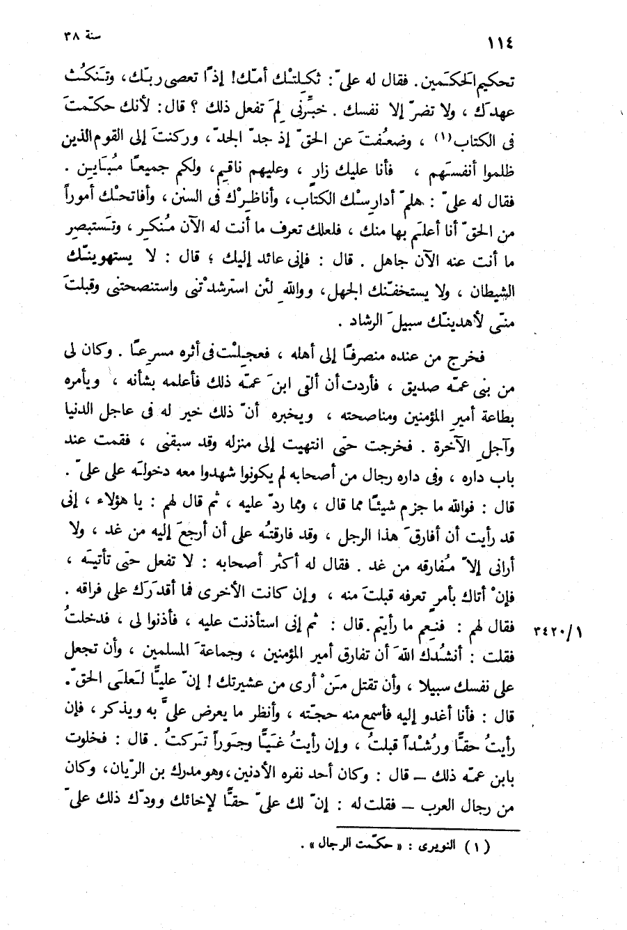 فَقَالَ لَهُ علي: هلم أدارسك الكتاب، وأناظرك فِي السنن، وأفاتحك أمورا من الحق أنا أعلم بِهَا مِنْكَ، فلعلك تعرف مَا أنت لَهُ الآن منكر، وتستبصر مَا أنت عنه الآن جاهل قَالَ: فإني عائد إليك، قَالَ: لا يستهوينك الشَّيْطَان، وَلا يستخفنك الجهل، وو الله لَئِنِ استرشدتني واستنصحتني وقبلت مني لأهدينك سبيل الرشاد] .