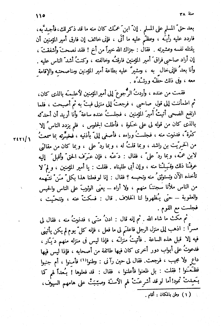 فقمت من عنده، وأردت الرجوع إِلَى أَمِير المؤمنين لا علمه بِالَّذِي كَانَ، ثُمَّ اطمأننت إِلَى قول صاحبي، فرجعت إِلَى منزلي فبت بِهِ ثُمَّ أصبحت، فلما ارتفع الضحى أتيت أَمِير الْمُؤْمِنِينَ، فجلست عنده ساعة وأنا أريد أن أحدثه بِالَّذِي كَانَ من قوله لي عَلَى خلوة، فأطلت الجلوس، فلم يزدد الناس إلا كثرة، فدنوت منه، فجلست وراءه، فاصغى الى باذنيه، فخبرته بِمَا سمعت من الخريت بن راشد، وبما قلت لَهُ، وبما رد علي، وبما كَانَ من مقالتي لابن عمه، وبما رد علي، فَقَالَ: دعه، فإن عرف الحق واقبل إِلَيْهِ عرفنا ذَلِكَ وقبلنا مِنْهُ، وإن أبى طلبناه فقلت: يَا أَمِيرَ الْمُؤْمِنِينَ، ولم لا تأخذه الآن وتستوثق مِنْهُ وتحبسه؟ فَقَالَ: إنا لو فعلنا هَذَا بكل من نتهمه مِنَ النَّاسِ ملأنا سجننا مِنْهُمْ، وَلا أراه- يعني الوثوب عَلَى الناس والحبس والعقوبة- حَتَّى يظهروا لنا الخلاف قَالَ: فسكت عنه، وتنحيت، فجلست مع القوم.