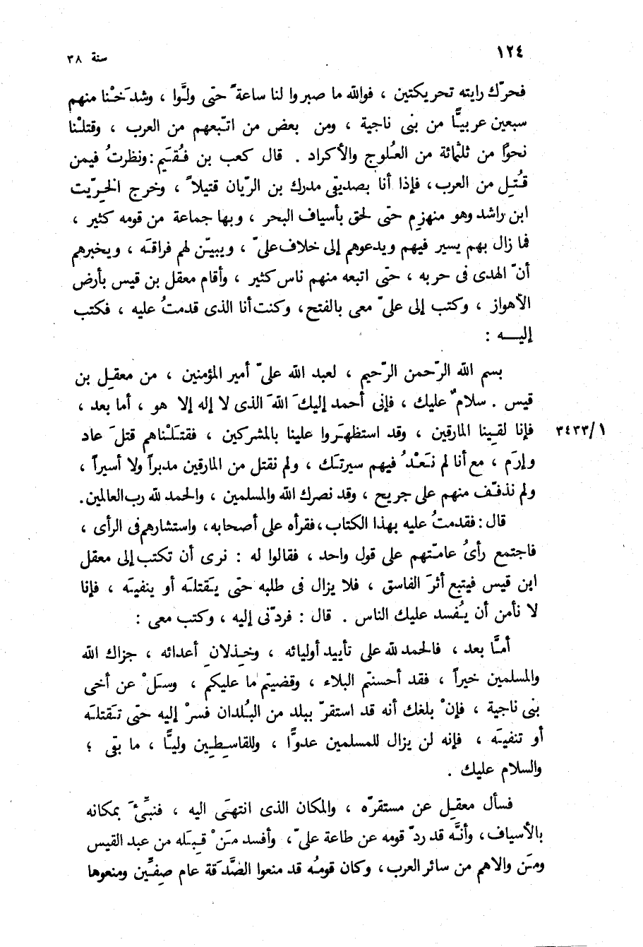 بِسْمِ اللَّهِ الرَّحْمَنِ الرَّحِيمِ، لعبد اللَّه علي أَمِير الْمُؤْمِنِينَ، من معقل بن قيس سلام عَلَيْك، فإني أحمد إليك اللَّه الَّذِي لا إله إلا هُوَ، أَمَّا بَعْدُ، فإنا لقينا المارقين، وَقَدِ استظهروا علينا بالمشركين، فقتلناهم قتل عاد وإرم، مع أنا لم نعد فِيهِمْ سيرتك، ولم نقتل من المارقين مدبرا ولا أسيرا، ولم نذفف مِنْهُمْ عَلَى جريح، وَقَدْ نصرك اللَّه والمسلمين، والحمد لِلَّهِ رب العالمين.