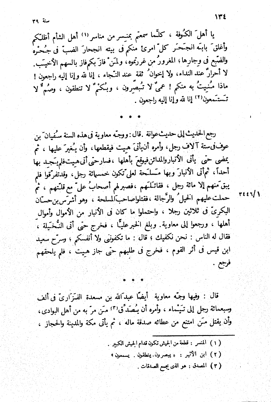 رجع الحديث إِلَى حديث عوانة قَالَ: ووجه مُعَاوِيَة فِي هَذِهِ السنة سُفْيَان بن عوف فِي ستة آلاف رجل، وأمره أن يأتي هيت فيقطعها، وأن يغير عَلَيْهَا، ثُمَّ يمضى حَتَّى يأتي الأنبار والمدائن فيوقع بأهلها، فسار حَتَّى أتى هيت فلم يجد بِهَا أحدا، ثُمَّ اتى الأنبار وبها مسلحه لعلى تكون خمسمائة رجل، وَقَدْ تفرقوا فلم يبق مِنْهُمْ إلا مائة رجل، فقاتلهم، فصبر لَهُمْ أَصْحَاب علي مع قلتهم، ثُمَّ حملت عَلَيْهِم الخيل والرجالة، فقتلوا صاحب المسلحة، وَهُوَ أشرس بن حسان البكري فِي ثَلاثِينَ رجلا، واحتملوا مَا كَانَ فِي الأنبار من الأموال وأموال أهلها، ورجعوا إِلَى مُعَاوِيَةَ [وبلغ الخبر عَلِيًّا، فخرج حَتَّى أتى النخيلة، فَقَالَ لَهُ الناس: نحن نكفيك، قَالَ: مَا تكفونني وَلا أنفسكم،] وسرح سَعِيد ابن قيس فِي أثر القوم، فخرج فِي طلبهم حَتَّى جاز هيت، فلم يلحقهم فرجع.