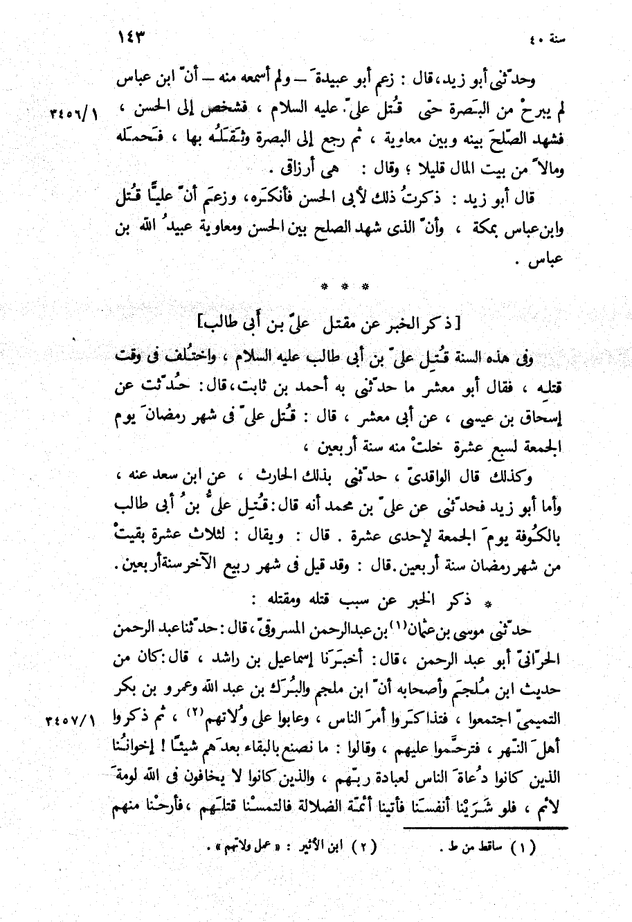 وفي هَذِهِ السنة قتل على بن ابى طالب ع، واختلف فِي وقت قتله، فَقَالَ أَبُو معشر مَا حَدَّثَنِي بِهِ أَحْمَد بْن ثَابِت، قَالَ: حدثت عن إسحاق بْن عيسى، عن أبي معشر، قَالَ: قتل علي فِي شهر رمضان يوم الجمعة لسبع عشرة خلت مِنْهُ سنة أربعين، وكذلك قَالَ الْوَاقِدِيُّ، حَدَّثَنِي بِذَلِكَ الْحَارِث، عن ابن سعد عنه، وَأَمَّا أَبُو زَيْدٍ فَحَدَّثَنِي عَنْ عَلِيِّ بْنِ مُحَمَّدٍ أنه قَالَ: قتل عَلِيّ بن أبي طالب بالكوفة يوم الجمعة لإحدى عشرة قَالَ: ويقال: لثلاث عشرة بقيت من شهر رمضان سنة أربعين قَالَ: وَقَدْ قيل فِي شهر ربيع الآخر سنة أربعين.