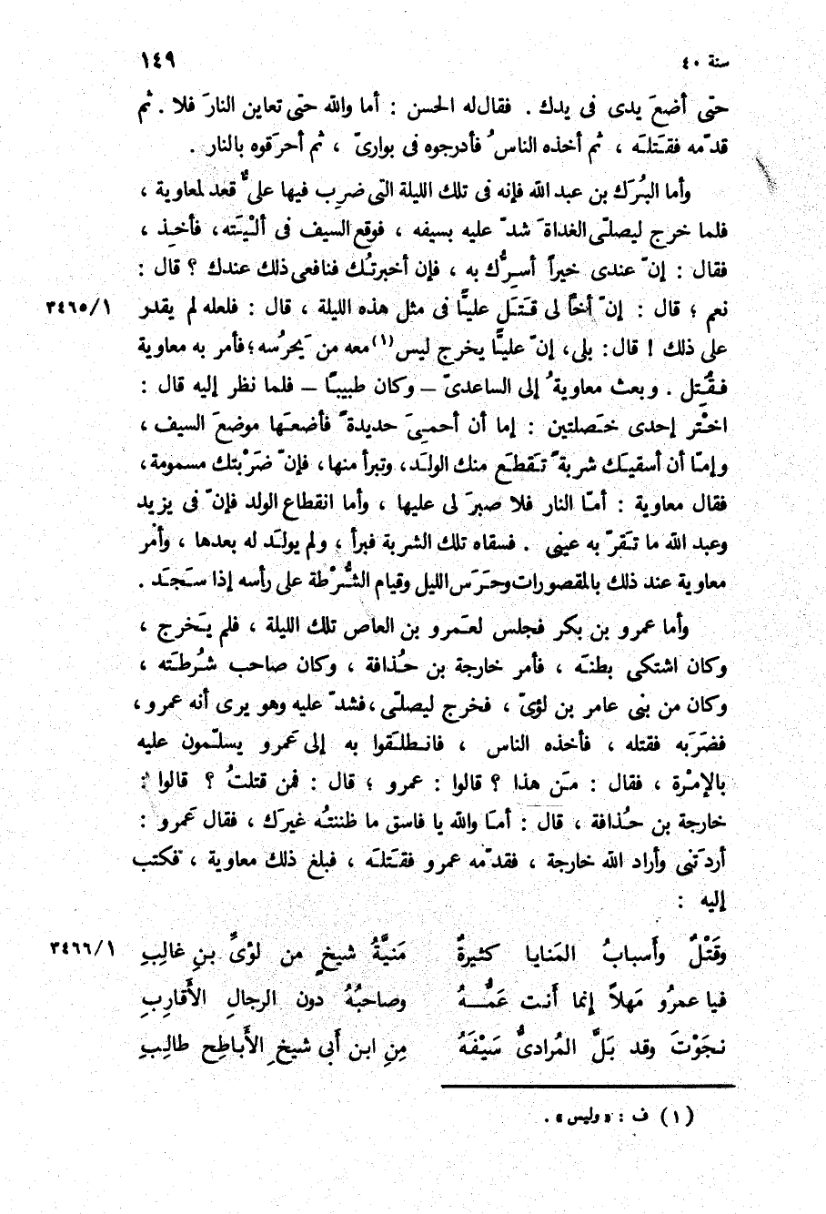 نعم، قَالَ: إن أخا لي قتل عَلِيًّا فِي مثل هَذِهِ الليلة، قَالَ: فلعله لم يقدر عَلَى ذَلِكَ! قَالَ: بلى، إن عَلِيًّا يخرج ليس مَعَهُ من يحرسه، فأمر بِهِ مُعَاوِيَة فقتل وبعث مُعَاوِيَة إِلَى الساعدي- وَكَانَ طبيبا- فلما نظر إِلَيْهِ قَالَ:
