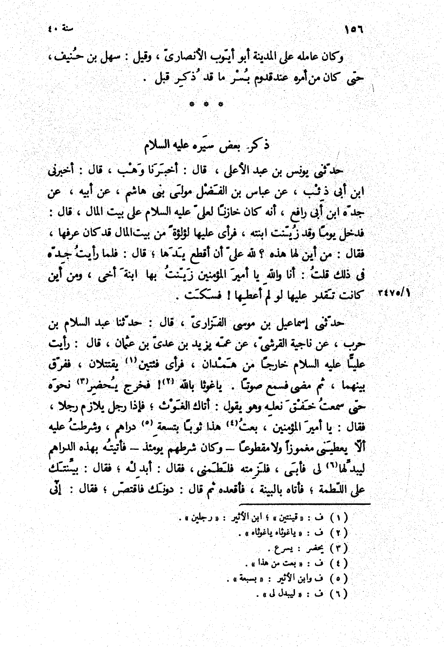 حَدَّثَنِي إِسْمَاعِيلُ بْنُ مُوسَى الْفَزَارِيُّ، قَالَ: حَدَّثَنَا عَبْدُ السَّلامِ بْنُ حَرْبٍ، عَنْ نَاجِيَةَ الْقُرَشِيِّ، عَنْ عَمِّهِ يَزِيدَ بْنِ عَدِيِّ بْنِ عُثْمَانَ، [قَالَ: رَأَيْتُ عَلِيًّا ع خَارِجًا مِنْ هَمْدَانَ، فَرَأَى فِئَتَيْنِ يَقْتَتِلانِ، فَفَرَّقَ بَيْنَهُمَا، ثُمَّ مَضَى فَسَمِعَ صَوْتًا يَا غَوْثًا بِاللَّهِ! فَخَرَجَ يَحْضُرُ نَحْوَهُ حَتَّى سَمِعْتُ خَفْقَ نَعْلِهِ وَهُوَ يَقُولُ: أَتَاكَ الْغَوْثُ، فَإِذَا رَجُلٌ يُلازِمُ رَجُلا، فَقَالَ: يَا أَمِيرَ الْمُؤْمِنِينَ، بِعْتُ هذا ثوبا بتسعه دراهم، وشرطت عليه الا يُعْطِيَنِي مَغْمُوزًا وَلا مَقْطُوعًا- وَكَانَ شَرْطَهُمْ يَوْمَئِذٍ- فَأَتَيْتُهُ بِهَذِهِ الدَّرَاهِمِ لِيُبَدِّلَهَا لِي فَأَبَى، فَلَزِمْتُهُ فَلَطَمَنِي، فَقَالَ: أَبْدِلْهُ، فَقَالَ: بَيِّنَتُكَ عَلَى اللَّطْمَةِ، فَأَتَاهُ بِالْبَيِّنَةِ، فَأَقْعَدَهُ ثُمَّ قَالَ: دُونَكَ فَاقْتَصَّ، فقال: انى