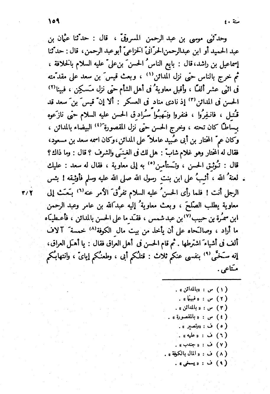 قَالَ: تُوثِقُ الْحَسَنَ، وَتَسْتَأْمِنُ بِهِ إِلَى مُعَاوِيَةَ، فَقَالَ لَهُ سَعْدٌ: عَلَيْكَ لَعْنَةُ اللَّهِ، أَثِبُ عَلَى ابْنِ بنت رسول الله ص فَأُوثِقُهُ! بِئْسَ الرَّجُلُ أَنْتَ! فَلَمَّا رَأَى الْحَسَنُ ع تَفَرُّقَ الأَمْرِ عَنْهُ بَعَثَ إِلَى مُعَاوِيَةَ يَطْلُبُ الصُّلْحَ، وَبَعَثَ مُعَاوِيَةُ إِلَيْهِ عَبْدَ اللَّهِ بْنَ عامر وعبد الرحمن ابن سمره بن حبيب بن عبد شمس، فقد ما عَلَى الْحَسَنِ بِالْمَدَائِنِ، فَأَعْطَيَاهُ مَا أَرَادَ، وَصَالَحَاهُ عَلَى أَنْ يَأْخُذَ مِنْ بَيْتِ مَالِ الْكُوفَةِ خَمْسَةَ آلافِ أَلْفٍ فِي أَشْيَاءَ اشْتَرَطَهَا [ثُمَّ قَامَ الْحَسَنُ فِي أَهْلِ الْعِرَاقِ فَقَالَ: يَا أهل العراق، إنه سخى بنفسي عنكم ثلاث: قَتْلُكُمْ أَبِي، وَطَعْنُكُمْ إِيَّايَ، وَانْتِهَابُكُمْ مَتَاعِي]