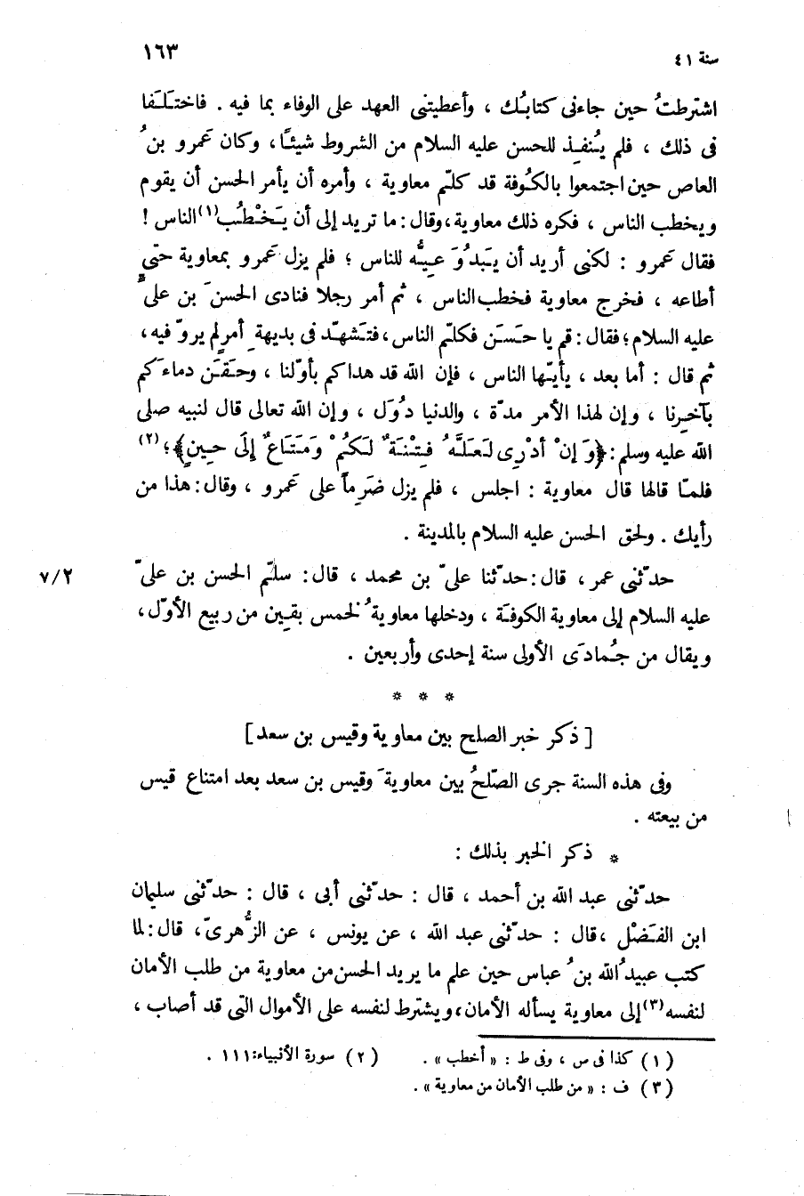 حَدَّثَنِي عُمَرُ، قَالَ: حَدَّثَنَا عَلِيُّ بْنُ مُحَمَّد، قال: سلم الحسن بن على ع إِلَى مُعَاوِيَةَ الْكُوفَة، ودخلها مُعَاوِيَة لخمس بقين من ربيع الأول، ويقال من جمادى الأولى سنه احدى واربعين.