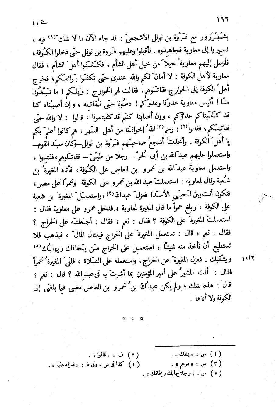 بشهرزور مع فروة بن نوفل الأشجعي: قَدْ جَاءَ الآن مَا لا شك فِيهِ، فسيروا إِلَى مُعَاوِيَةَ فجاهدوه فأقبلوا وعليهم فروة بن نوفل حَتَّى دخلوا الْكُوفَة، فأرسل إِلَيْهِم مُعَاوِيَة خيلا من خيل أهل الشام، فكشفوا أهل الشام، فَقَالَ مُعَاوِيَة لأهل الْكُوفَة: لا أمان لكم وَاللَّهِ عندي حَتَّى تكفوا بوائقكم، فخرج أهل الْكُوفَة إِلَى الخوارج فقاتلوهم، فَقَالَتْ لَهُمُ الخوارج: ويلكم! مَا تبغون منا! أليس مُعَاوِيَة عدونا وعدوكم! دعونا حَتَّى نقاتله، وإن أصبناه كنا قَدْ كفيناكم عدوكم، وإن أصابنا كنتم قَدْ كفيتمونا، قَالُوا: لا وَاللَّهِ حَتَّى نقاتلكم، فَقَالُوا: رحم اللَّه إخواننا من أهل النهر، هم كَانُوا أعلم بكم يَا أَهْلَ الْكُوفَةِ وأخذت أشجع صاحبهم فروة بن نوفل- وَكَانَ سيد القوم- واستعملوا عَلَيْهِم عَبْد اللَّهِ بن أبي الحر- رجلا من طيئ- فقاتلوهم، فقتلوا، وَاسْتَعْمَلَ مُعَاوِيَة عَبْد اللَّهِ بن عَمْرو بن الْعَاصِ عَلَى الْكُوفَة، فأتاه الْمُغِيرَة بن شُعْبَةَ وَقَالَ لمعاوية: استعملت عَبْد اللَّهِ بن عَمْرو عَلَى الْكُوفَة وعمرا عَلَى مصر، فتكون أنت بين لحيي الأسد! فعزل عبد الله، وَاسْتَعْمَلَ الْمُغِيرَة بن شُعْبَةَ عَلَى الْكُوفَة، وبلغ عمرا مَا قَالَ الْمُغِيرَة لمعاوية، فدخل عَمْرو عَلَى مُعَاوِيَة فَقَالَ: