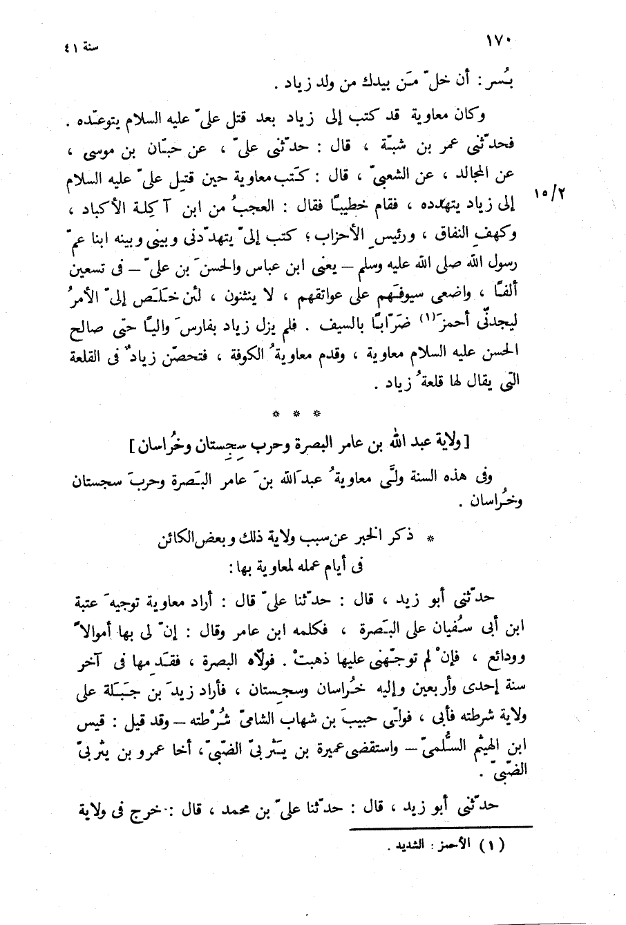 فحدثني عمر بن شبة، قال: حدثني علي، عَنْ حِبَّانَ بْنِ مُوسَى، عَنِ الْمُجَالِدِ، عَنِ الشَّعْبِيِّ، قَالَ: كَتَبَ مُعَاوِيَةُ حِينَ قُتِلَ عَلِيٌّ ع إِلَى زِيَادٍ يَتَهَدَّدُهُ، فَقَامَ خَطِيبًا فَقَالَ: الْعَجَبُ مِنَ ابْنِ آكِلَةِ الأَكْبَادِ، وَكَهْفِ النِّفَاقِ، وَرَئِيسِ الأحزاب، كَتَبَ إِلَيَّ يَتَهَدَّدُنِي وَبَيْنِي وَبَيْنَهُ ابْنَا عَمِّ رسول الله ص- يَعْنِي ابْنَ عَبَّاسٍ وَالْحَسَنَ بْنَ عَلِيٍّ- فِي تِسْعِينَ أَلْفًا، وَاضِعِي سُيُوفِهِمْ عَلَى عَوَاتِقِهِمْ، لا يَنْثَنُونَ، لَئِنْ خَلَصَ إِلَيَّ الأَمْرُ لَيَجِدُنِي أَحْمَزَ ضَرَّابًا بِالسَّيْفِ فَلَمْ يَزَلْ زِيَادٌ بِفَارِسَ وَالِيًا حتى صالح الحسن ع مُعَاوِيَةَ، وَقَدِمَ مُعَاوِيَةُ الْكُوفَةَ، فَتَحَصَّنَ زِيَادٌ فِي القلعة التي يقال لها قلعه زياد