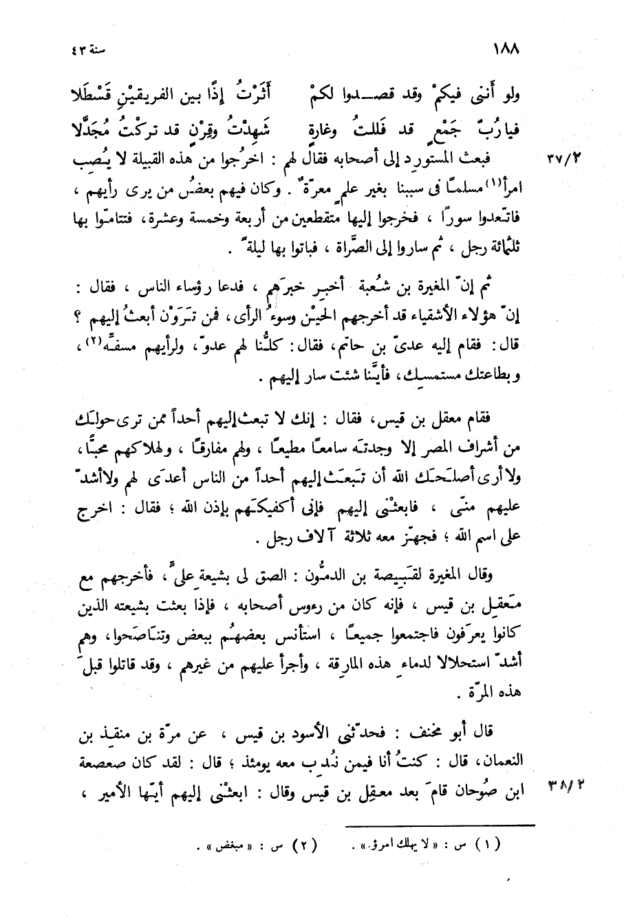 قَالَ أَبُو مخنف: فَحَدَّثَنِي الأسود بن قيس، عن مرة بن منقذ بن النُّعْمَانِ، قَالَ: كنت أنا فيمن ندب مَعَهُ يومئذ، قال: لقد كان صعصعة ابن صُوحَانَ قام بعد معقل بن قيس وَقَالَ: ابعثني إِلَيْهِم أيها الأمير،