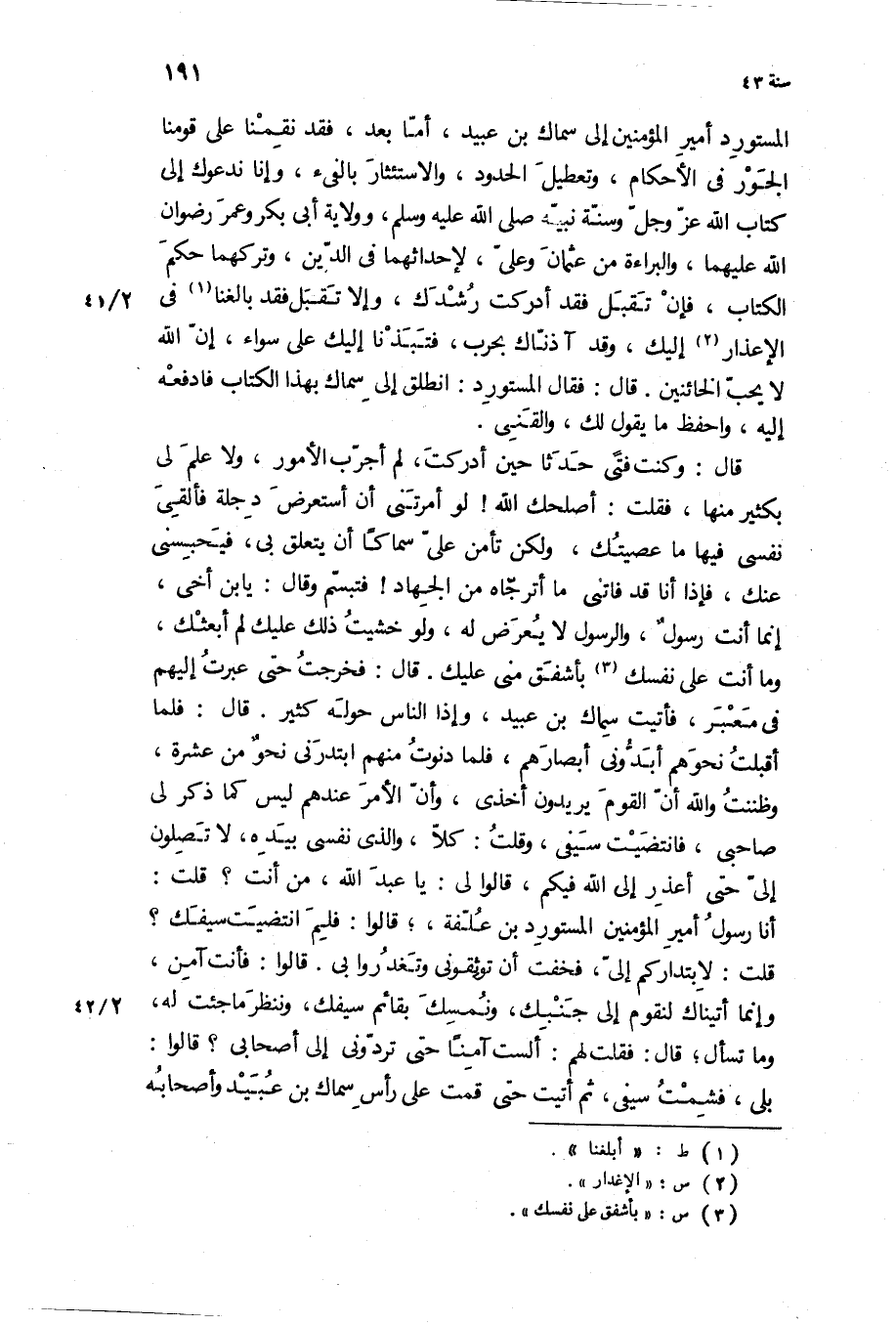 المستورد أَمِير الْمُؤْمِنِينَ إِلَى سماك بن عبيد، أَمَّا بَعْدُ، فقد نقمنا عَلَى قومنا الجور فِي الأحكام، وتعطيل الحدود، والاستئثار بالفيء، وإنا ندعوك إِلَى كتاب اللَّه عَزَّ وَجَلَّ وسنة نبيه ص، وولاية أبي بكر وعمر رضوان اللَّه عليهما، والبراءة من عُثْمَان وعلي، لإحداثهما فِي الدين، وتركهما حكم الكتاب، فإن تقبل فقد أدركت رشدك، والا تقبل فقد بالغنا فِي الإعذار إليك، وَقَدْ آذناك بحرب، فنبذنا إليك عَلَى سواء، إن اللَّه لا يحب الخائنين قَالَ: فَقَالَ المستورد: انطلق إِلَى سماك بهذا الكتاب فادفعه إِلَيْهِ، واحفظ مَا يقول لك، والقَني قَالَ: وكنت فتى حدثا حين أدركت، لم أجرب الأمور، وَلا علم لي بكثير منها، فقلت: أصلحك اللَّه! لو أمرتني أن أستعرض دجلة فألقي نفسي فِيهَا مَا عصيتك، ولكن تأمن علي سماكا أن يتعلق بي، فيحبسني عنك، فإذا أنا قَدْ فاتني ما اترجاه من الجهاد! فتبسم وقال: يا بن أخي، إنما أنت رسول، والرسول لا يعرض لَهُ، ولو خشيت ذَلِكَ عَلَيْك لم أبعثك، وما أنت عَلَى نفسك بأشفق مني عَلَيْك قَالَ: فخرجت حَتَّى عبرت إِلَيْهِم فِي معبر، فأتيت سماك بن عبيد، وإذا الناس حوله كثير قَالَ: فلما أقبلت نحوهم أبدوني أبصارهم، فلما دنوت مِنْهُمُ ابتدرني نحو من عشرة، وظننت وَاللَّهِ أن القوم يريدون أخذي، وأن الأمر عندهم ليس كما ذكر لي صاحبي، فانتضيت سيفي، وقلت: كلا، والذي نفسي بيده، لا تصلون إلي حَتَّى أعذر إِلَى اللَّهِ فيكم، قَالُوا لي: يَا عَبْد اللَّهِ، من أنت؟ قلت: