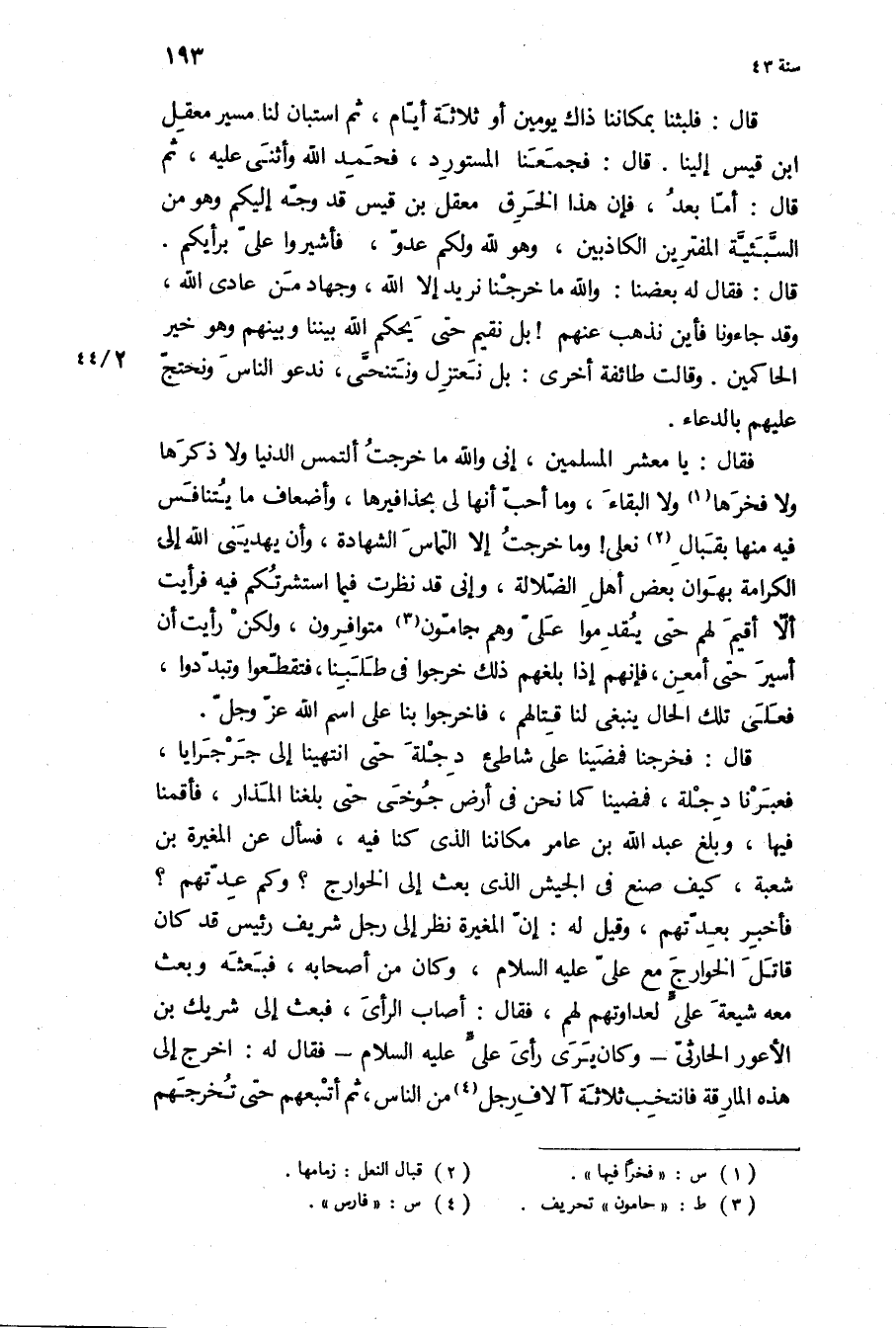 قَالَ: فلبثنا بمكاننا ذاك يومين أو ثلاثة ايام، ثم استبان لنا مسير معقل ابن قيس إلينا قَالَ: فجمعنا المستورد، فَحَمِدَ اللَّهَ وَأَثْنَى عَلَيْهِ، ثُمَّ قَالَ: أَمَّا بَعْدُ، فإن هذا الخرق معقل بن قيس قَدْ وجه إليكم وَهُوَ من السبئيه المفترين الكاذبين، وَهُوَ لِلَّهِ ولكم عدو، فأشيروا علي برأيكم قَالَ: فَقَالَ لَهُ بعضنا: وَاللَّهِ مَا خرجنا نريد إلا اللَّه، وجهاد من عادى اللَّه، وَقَدْ جاءونا فأين نذهب عَنْهُمْ! بل نقيم حَتَّى يحكم اللَّه بيننا وبينهم وَهُوَ خير الحاكمين وقالت طائفة أخرى: بل نعتزل ونتنحى، ندعو الناس ونحتج عَلَيْهِم بالدعاء.
