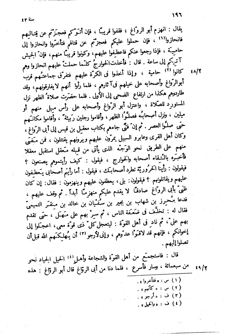 فيقولون: رأينا الحرورية تطرد أَصْحَابك، فيقول: أما رأيتم أَصْحَابي يعطفون عَلَيْهِم ويقاتلونهم؟ فيقولون: بلى، يعطفون عَلَيْهِم وينهزمون: فَقَالَ: إن كَانَ ظني بأبي الرواغ صادقا لا يقدم عَلَيْكُمْ منهزما أبدا ثُمَّ وقف عَلَيْهِم، فدعا محرز بن شهاب بن بجير بن سُفْيَان بن خَالِد بن منقر التميمي فَقَالَ لَهُ: تخلف فِي ضعفة الناس، ثُمَّ سر بهم عَلَى مهل، حَتَّى تقدم بهم علي، ثُمَّ ناد فِي أهل القوة: ليتعجل كل ذي قوة معي، اعجلوا إِلَى إخوانكم، فإنهم قَدْ لاقوا عدوهم، وإني لأرجو أن يهلكهم اللَّه قبل أن تصلوا إِلَيْهِم.