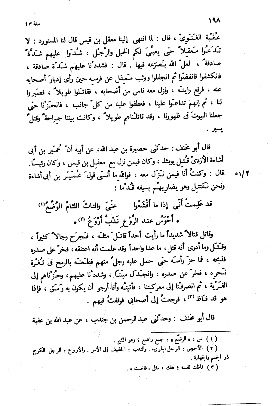 وقاتل قتالا شديدا مَا رأيت أحدا قاتل مثله، فجرح رجالا كثيرا، وقتل وما أدري أنه قتل، مَا عدا واحدا وَقَدْ علمت أنه اعتنقه، فخر عَلَى صدره فذبحه، فما حز رأسه حَتَّى حمل عَلَيْهِ رجل مِنْهُمْ فطعنه بالرمح فِي ثغرة نحره، فخر عن صدره، وانجدل ميتا، وشددنا عَلَيْهِم، وحزناهم إِلَى القرية، ثُمَّ انصرفنا إِلَى معركتنا، فأتيته وأنا أرجو أن يكون بِهِ رمق، فإذا هُوَ قَدْ فاظ، فرجعت إِلَى أَصْحَابي فوقفت فِيهِمْ قَالَ أَبُو مخنف: وَحَدَّثَنِي عبد الرَّحْمَن بن جندب، عن عَبْد اللَّهِ بن عُقْبَةَ