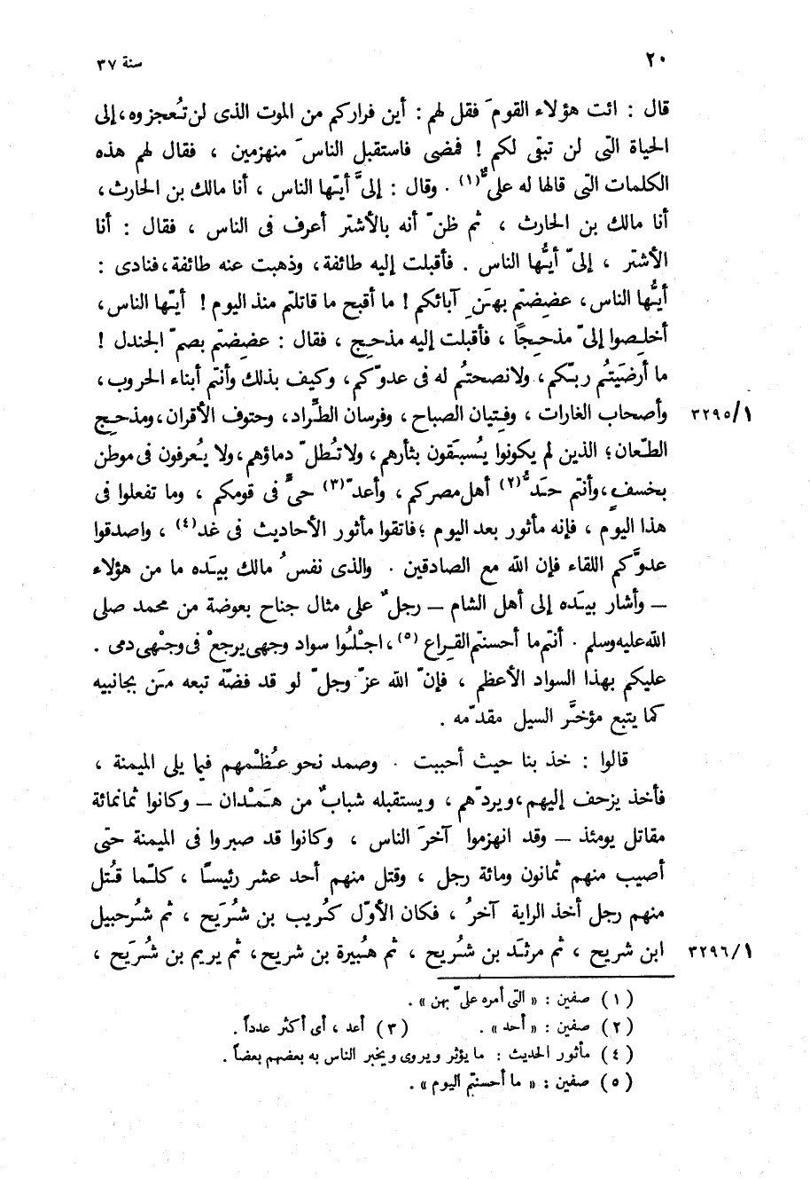 أَيُّهَا النَّاسُ، عضضتم بهن آبائكم! مَا أقبح مَا قاتلتم منذ الْيَوْم! أَيُّهَا النَّاسُ، أخلصوا إلي مذحجا، فأقبلت إِلَيْهِ مذحج، فَقَالَ: عضضتم بصم الجندل! مَا أرضيتم ربكم، وَلا نصحتم لَهُ فِي عدوكم، وكيف بِذَلِكَ وَأَنْتُمْ أبناء الحروب، وأَصْحَاب الغارات، وفتيان الصباح، وفرسان الطراد، وحتوف الأقران، ومذحج الطعان، الَّذِينَ لم يكونوا يسبقون بثأرهم، وَلا تطل دماؤهم، وَلا يعرفون فِي موطن بخسف، وَأَنْتُمْ حد أهل مصركم، وأعد حي فِي قومكم، وما تفعلوا فِي هَذَا الْيَوْم، فإنه مأثور بعد الْيَوْم، فاتقوا مأثور الأحاديث فِي غد، واصدقوا عدوكم اللقاء فإن اللَّه مع الصادقين والذي نفس مالك بيده مَا من هَؤُلاءِ- وأشار بيده إِلَى أهل الشام- رجل عَلَى مثال جناح بعوضة من محمد ص أنتم ما احسنتم القراع، اجلوا سواد وجهي يرجع فِي وجهي دمي.