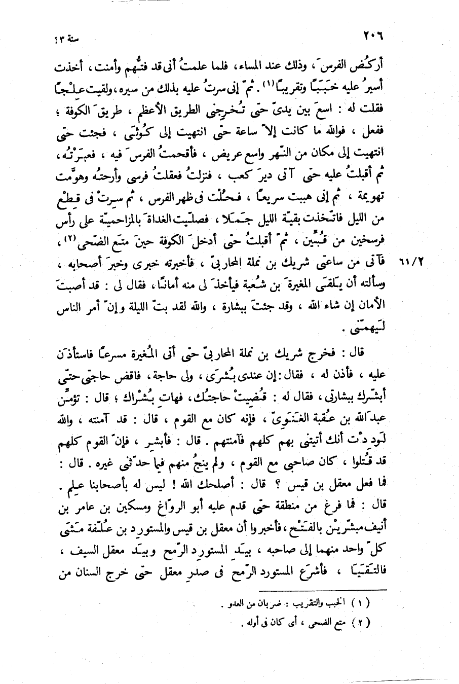 أركض الفرس، وَذَلِكَ عِنْدَ المساء، فلما علمت أني قَدْ فتهم وأمنت، أخذت أسير عَلَيْهِ خببا وتقريبا ثُمَّ إني سرت عَلَيْهِ بِذَلِكَ من سيره، ولقيت علجا فقلت لَهُ: اسع بين يدي حَتَّى تخرجني الطريق الأعظم، طريق الْكُوفَة، ففعل، فو الله مَا كَانَتْ إلا ساعة حَتَّى انتهيت إِلَى كوثى، فجئت حَتَّى انتهيت إِلَى مكان من النهر واسع عريض، فأقحمت الفرس فِيهِ، فعبرته، ثُمَّ أقبلت عَلَيْهِ حَتَّى آتى دير كعب، فنزلت فعقلت فرسي وأرحته وهومت تهويمة، ثُمَّ انى هببت سريعا، فخلت فِي ظهر الفرس، ثُمَّ سرت فِي قطع من الليل فاتخذت بقية الليل جملا، فصليت الغداة بالمزاحمية عَلَى رأس فرسخين من قبين، ثُمَّ أقبلت حَتَّى أدخل الْكُوفَة حين متع الضحى، فآتى من ساعتي شريك بن نملة المحاربي، فأخبرته خبري وخبر أَصْحَابه، وسألته أن يلقى الْمُغِيرَة بن شُعْبَةَ فيأخذ لي مِنْهُ أمانا، فَقَالَ لي: قَدْ أصبت الأمان إِنْ شَاءَ اللَّهُ، وَقَدْ جئت ببشارة، وَاللَّهِ لقد بت الليلة وإن أمر الناس ليهمني قَالَ: فخرج شريك بن نملة المحاربي حَتَّى أتى الْمُغِيرَة مسرعا فاستأذن عَلَيْهِ، فأذن لَهُ، فَقَالَ: إن عندي بشرى، ولي حاجة، فاقض حاجتي حَتَّى أبشرك ببشارتي، فَقَالَ لَهُ: قضيت حاجتك، فهات بشراك، قَالَ: تؤمن عَبْد اللَّهِ بن عُقْبَةَ الغنوي، فإنه كَانَ مع القوم، قَالَ: قَدْ آمنته، وَاللَّهِ لوددت أنك أتيتني بهم كلهم فآمنتهم قَالَ: فأبشر، فإن القوم كلهم قَدْ قتلوا، كَانَ صاحبي مع القوم، ولم ينج مِنْهُمْ فِيمَا حَدَّثَنِي غيره قَالَ: