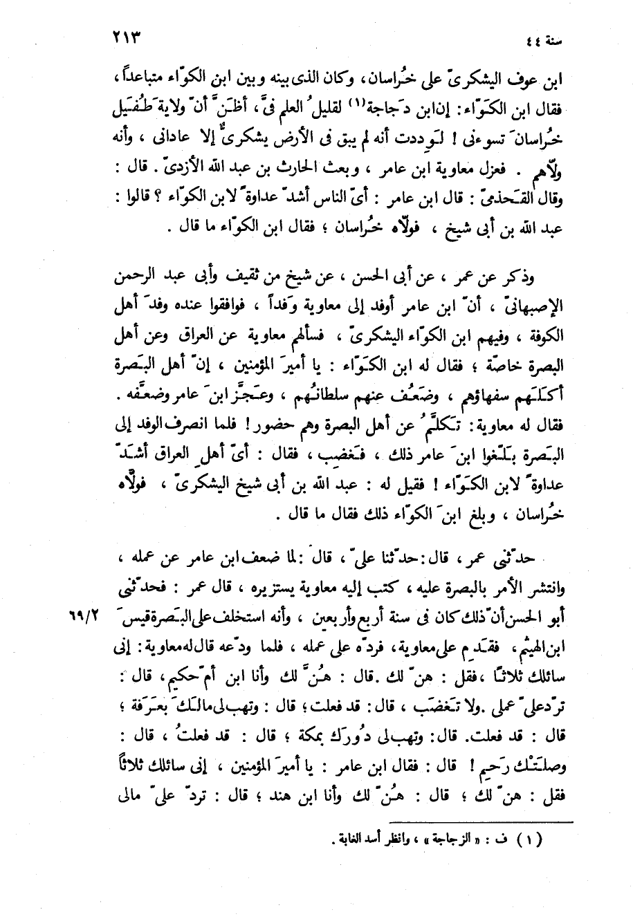 وَذُكِرَ عَنْ عُمَرَ، عَنْ أَبِي الْحَسَنِ، عَنْ شَيْخٍ مِنْ ثَقِيفٍ وَأَبِي عَبْدِ الرَّحْمَنِ الأَصْبَهَانِيِّ، أَنَّ ابْنَ عَامِرٍ أَوْفَدَ إِلَى مُعَاوِيَةَ وَفْدًا، فَوَافَقُوا عِنْدَهُ وَفْدَ أَهْلِ الْكُوفَةِ، وَفِيهِمُ ابْنُ الْكَوَّاءِ الْيَشْكُرِيُّ، فَسَأَلَهُمْ مُعَاوِيَةُ عَنِ الْعِرَاقِ وَعَنْ أَهْلِ الْبَصْرَةِ خَاصَّةً، فَقَالَ لَهُ ابْنُ الْكَوَّاءِ: يَا أَمِيرَ الْمُؤْمِنِينَ، إِنَّ أَهْلَ الْبَصْرَةِ أَكَلَهُمْ سُفَهَاؤُهُمْ، وَضَعُفَ عَنْهُمْ سُلْطَانُهُمْ، وَعَجَزَ ابْنُ عَامِرٍ وَضَعَّفَهُ.