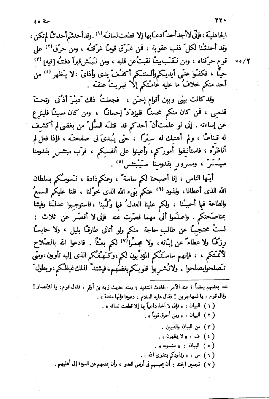 الجاهلية، فانى لا أجد أَحَدًا دَعَا بِهَا إِلا قَطَعْتُ لِسَانَهُ وَقَدْ أَحْدَثْتُمْ أَحْدَاثًا لَمْ تَكُنْ، وَقَدْ أَحْدَثْنَا لِكُلِّ ذَنْبٍ عُقُوبَةً، فَمَنْ غَرَّقَ قَوْمًا غَرَّقْتُهُ، وَمَنْ حَرَّقَ عَلَى قَوْمٍ حَرَّقْنَاهُ، وَمَنْ نَقَبَ بَيْتًا نَقَبْتُ عَنْ قَلْبِهِ، وَمَنْ نَبَشَ قَبْرًا دَفَنْتُهُ فِيهِ حَيًّا، فَكُفُّوا عَنِّي أَيْدِيَكُمْ وَأَلْسِنَتَكُمْ أَكْفُفْ يَدِي وَأَذَايَ، لا يَظْهَرُ مِنْ أَحَدٍ مِنْكُمْ خِلافُ مَا عَلَيْهِ عَامَّتُكُمْ إِلا ضَرَبْتُ عُنُقَهُ.