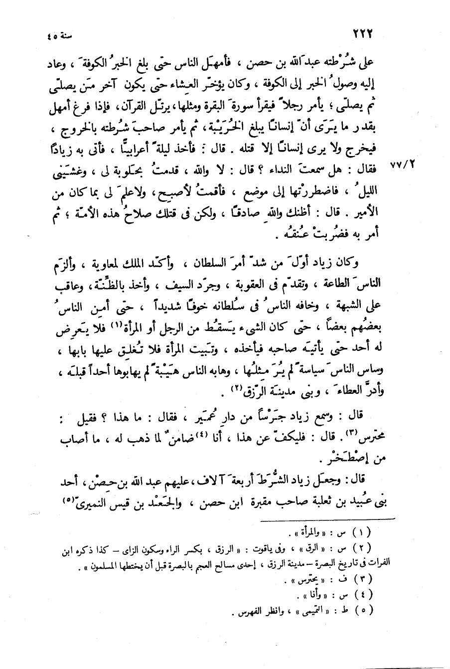عَلَى شُرْطَتِهِ عَبْدَ اللَّهِ بْنَ حِصْنٍ، فَأَمْهَلَ النَّاسَ حَتَّى بَلَغَ الْخَبَرُ الْكُوفَةَ، وَعَادَ إِلَيْهِ وُصُولُ الْخَبَرِ إِلَى الْكُوفَةِ، وَكَانَ يُؤَخِّرُ الْعِشَاءَ حَتَّى يَكُونَ آخِرَ مَنْ يُصَلِّي ثُمَّ يُصَلِّي، يَأْمُرُ رَجُلا فَيَقْرَأُ سُورَةَ الْبَقَرَةِ وَمِثْلَهَا، يُرَتِّلُ الْقُرْآنَ، فَإِذَا فَرَغَ أَمْهَلَ بِقَدْرِ مَا يَرَى أَنَّ إِنْسَانًا يَبْلُغُ الْخُرَيْبَةَ، ثُمَّ يَأْمُرُ صَاحِبَ شُرْطَتِهِ بِالْخُرُوجِ، فَيَخْرُجُ وَلا يَرَى إِنْسَانًا إِلا قَتَلَهُ قَالَ: فَأَخَذَ لَيْلَةً أَعْرَابِيًّا، فَأَتَى بِهِ زِيَادًا فَقَالَ: هَلْ سَمِعْتَ النِّدَاءَ؟ قَالَ: لا وَاللَّهِ، قَدِمْتُ بِحَلُوبَةٍ لِي، وَغَشِيَنِي اللَّيْلُ، فَاضْطَرَرْتُهَا إِلَى مَوْضِعٍ، فَأَقَمْتُ لأُصْبِحَ، وَلا عِلْمَ لِي بِمَا كَانَ مِنَ الأَمِيرِ قَالَ: أَظُنُّكَ وَاللَّهِ صَادِقًا، وَلَكِنْ فِي قَتْلِكَ صَلاحُ هَذِهِ الأُمَّةِ، ثُمَّ أَمَرَ بِهِ فَضُرِبَتْ عُنُقُهُ.