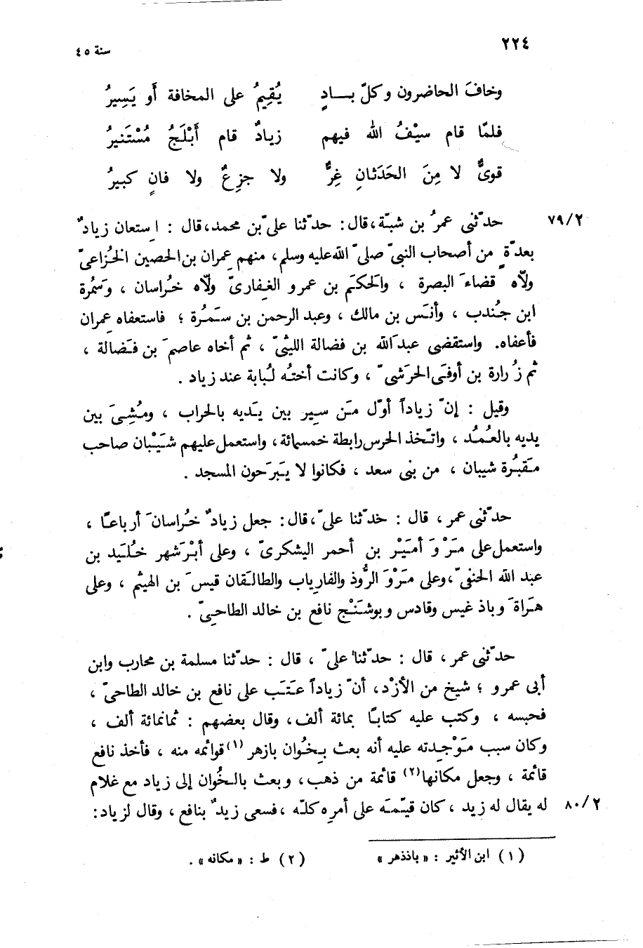 حَدَّثَنِي عمر، قال: حدثنا علي، قال: حدثنا مسلمة بْنُ مُحَارِبٍ وَابْنُ أَبِي عَمْرٍو، شَيْخٌ مِنَ الأَزْدِ، أَنَّ زِيَادًا عَتَبَ عَلَى نَافِعِ بْنِ خَالِدٍ الطَّاحِيَّ، فَحَبَسَهُ، وَكَتَبَ عَلَيْهِ كِتَابًا بِمِائَةِ الف، وقال بعضهم: ثمانمائه أَلْفٍ، وَكَانَ سَبَبُ مَوْجِدَتِهِ عَلَيْهِ أَنَّهُ بَعَثَ بِخُوَانٍ بَازَهْر قَوَائِمُهُ مِنْهُ، فَأَخَذَ نَافِعٌ قَائِمَةً، وجعل مكانها قَائِمَةً مِنْ ذَهَبٍ، وَبَعَثَ بِالْخُوَانِ إِلَى زِيَادٍ مَعَ غُلامٍ لَهُ يُقَالُ لَهُ زَيْدٌ، كَانَ قَيِّمَهُ عَلَى أَمْرِهِ كُلِّهِ، فَسَعَى زَيْدٌ بِنَافِعٍ، وقال لزياد: