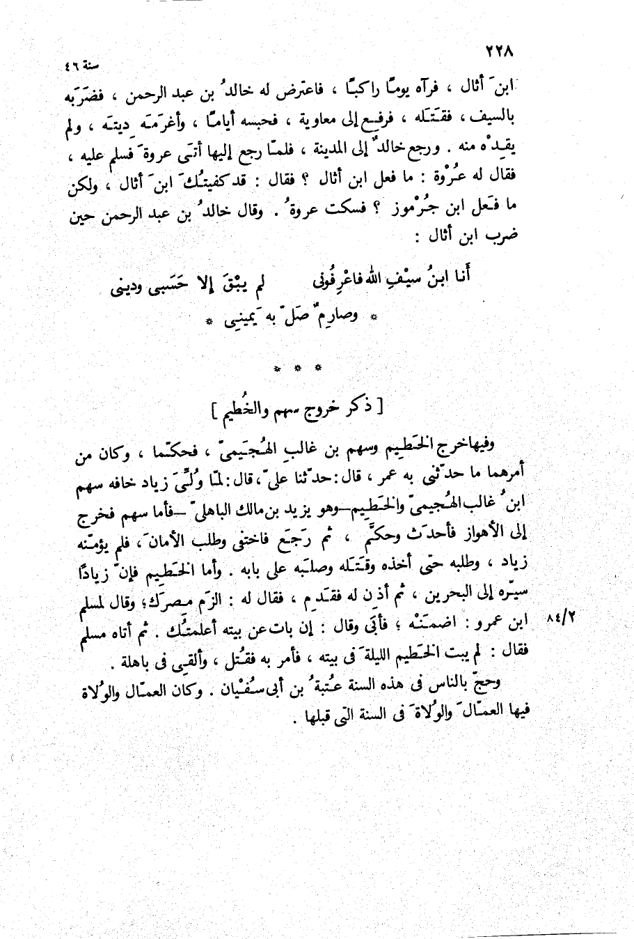 وفيها خرج الخطيم وسهم بن غالب الهجيمي، فحكما، وَكَانَ من أمرهما مَا حَدَّثَنِي بِهِ عمر، قَالَ: حَدَّثَنَا عَلِيٌّ، قَالَ: لما ولي زياد خافه سهم ابن غالب الهجيمي والخطيم- وَهُوَ يَزِيد بن مالك الباهلي- فأما سهم فخرج إِلَى الأهواز فأحدث وحكم، ثُمَّ رجع فاختفى وطلب الأمان، فلم يؤمنه زياد، وطلبه حَتَّى أخذه وقتله وصلبه عَلَى بابه وأما الخطيم فإن زيادا سيره إِلَى البحرين، ثُمَّ أذن لَهُ فقدم، فَقَالَ له: الزم مصرك، وقال لمسلم ابن عَمْرو: اضمنه، فأبى وَقَالَ: إن بات عن بيته أعلمتك ثُمَّ أتاه مسلم فَقَالَ: لم يبت الخطيم الليلة فِي بيته، فأمر بِهِ فقتل، وألقي فِي باهلة.