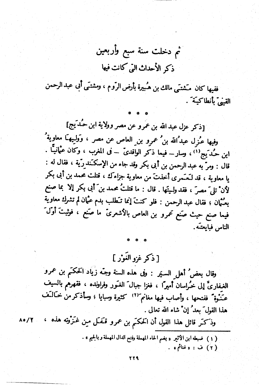 وفيها عزل عَبْدِ اللَّهِ بْنِ عَمْرِو بْنِ الْعَاصِ عَنْ مصر، ووليها معاويه ابن حديج، وسار- فِيمَا ذكر الْوَاقِدِيّ- فِي المغرب، وَكَانَ عثمانيا.