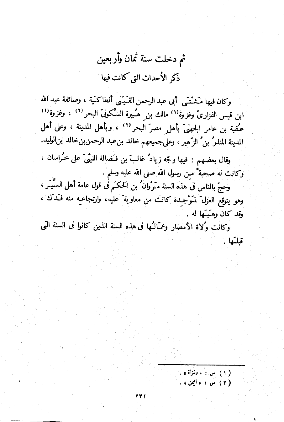 (ذكر الأحداث الَّتِي كَانَتْ فِيهَا) وَكَانَ فِيهَا مشتى أبي عبد الرَّحْمَن القيني أنطاكية، وصائفة عَبْد اللَّهِ ابن قيس الفزاري وغزوة مالك بن هبيرة السكوني البحر، وغزوة عقبة بن عَامِر الجهني بأهل مصر البحر، وبأهل الْمَدِينَة، وعلى أهل الْمَدِينَة المنذر بن الزهير، وعلى جميعهم خَالِد بن عَبْدِ الرَّحْمَنِ بْنِ خَالِد بن الْوَلِيد.
