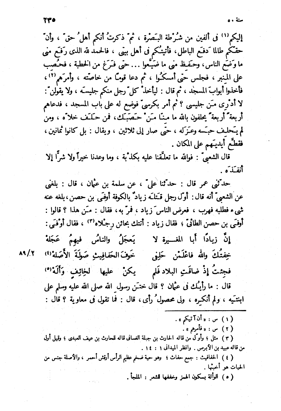 حَدَّثَنِي عُمَرُ قَالَ: حَدَّثَنَا عَلِيٌّ، عَنْ سَلَمَةَ بْنِ عُثْمَانَ، قَالَ: بَلَغَنِي عَنِ الشَّعْبِيِّ أَنَّهُ قَالَ: أَوَّلُ رَجُلٍ قَتَلَهُ زِيَادٌ بِالْكُوفَةِ أَوْفَى بْنُ حِصْنٍ، بَلَغَهُ عَنْهُ شَيْءٌ فَطَلَبَهُ فَهَرَبَ، فَعَرَضَ النَّاسَ زِيَادٌ، فَمَرَّ بِهِ، فَقَالَ: مَنْ هَذَا؟ قَالُوا: