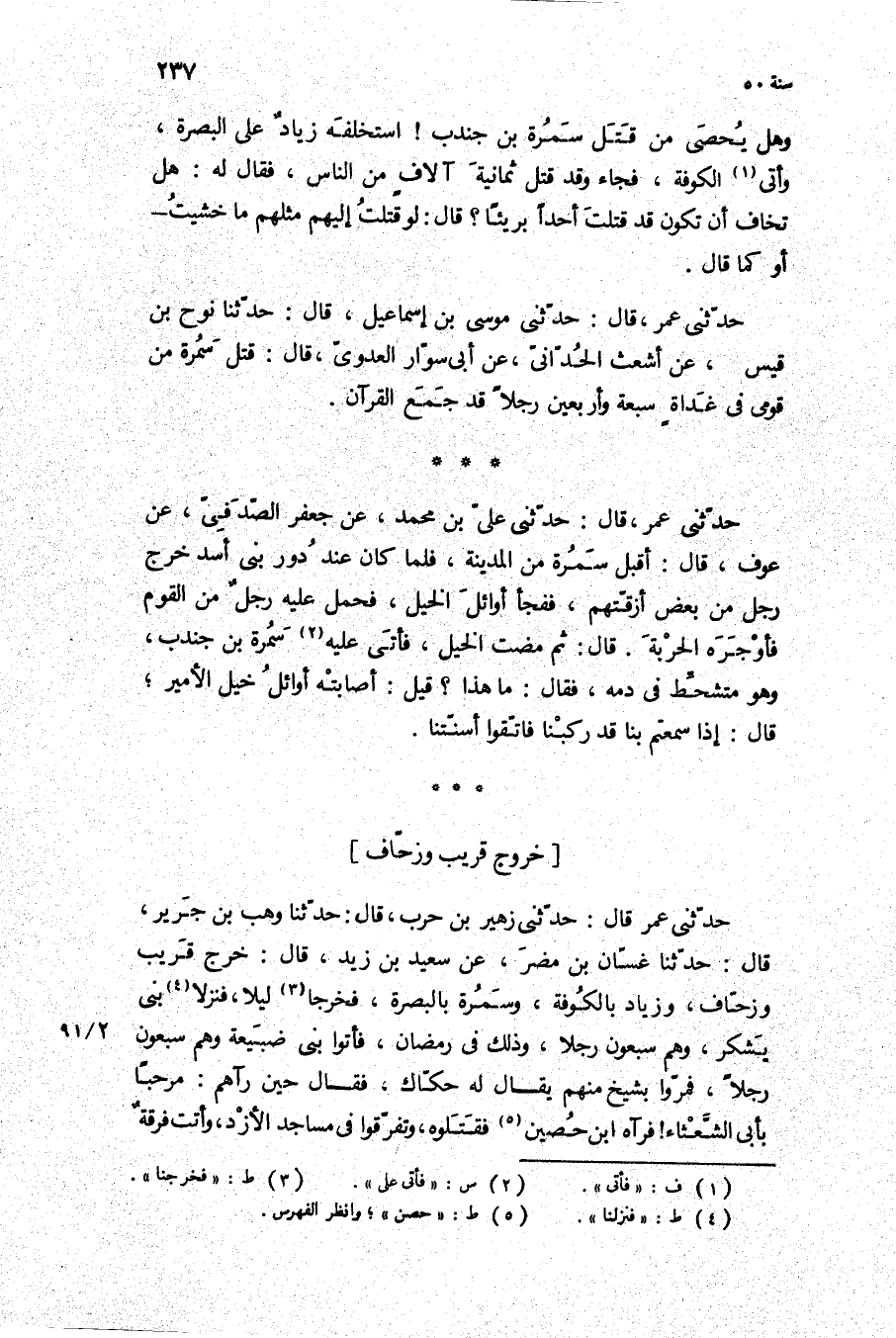 حدثني عمر قَالَ: حَدَّثَنِي زهير بن حرب، قَالَ: حَدَّثَنَا وَهْبُ بْنُ جَرِيرٍ، قَالَ: حَدَّثَنَا غَسَّانُ بْنُ مُضَرَ، عَنْ سَعِيدِ بْنِ زَيْدٍ، قَالَ: خَرَجَ قَرِيبٌ وَزحاف، وَزِيَادٌ بِالْكُوفَةِ، وَسَمُرَةُ بالبصرة، فخرجا ليلا، فنزلا بَنِي يَشْكُرَ، وَهُمْ سَبْعُونَ رَجُلا، وَذَلِكَ فِي رَمَضَانَ، فَأَتَوْا بَنِي ضُبَيْعَةَ وَهُمْ سَبْعُونَ رَجُلا، فَمَرُّوا بِشَيْخٍ مِنْهُمْ يُقَالُ لَهُ حكاك، فَقَالَ حِينَ رَآهُمْ: مَرْحَبًا بِأَبِي الشَّعْثَاءِ! فَرَآهُ ابْنُ حُصَيْنٍ فَقَتَلُوهُ، وَتَفَرَّقُوا فِي مَسَاجِدِ الأَزْدِ، وَأَتَتْ فرقه
