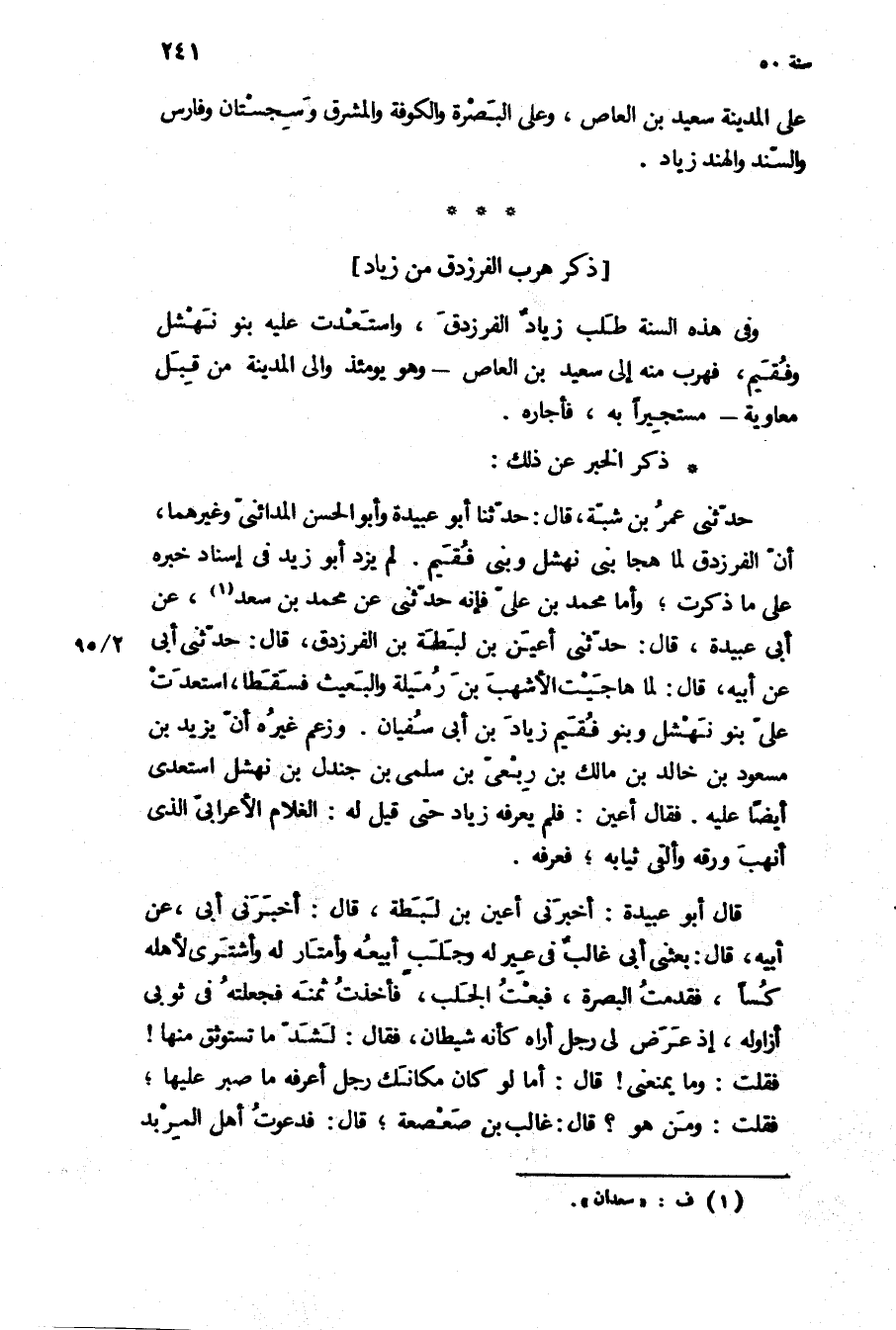 حَدَّثَنِي عُمَرُ بْنُ شَبَّةَ، قَالَ: حَدَّثَنَا أَبُو عبيدة وأبو الْحَسَن المدائني وغيرهما، أن الفرزدق لما هجا بني نهشل وبني فقيم لم يزد أَبُو زَيْد فِي إسناد خبره عَلَى مَا ذكرت، وأما مُحَمَّد بن علي فإنه حَدَّثَنِي عَنْ مُحَمَّدِ بْنِ سعد، عن أبي عبيدة، قَالَ: حَدَّثَنِي أعين بن لبطة بن الفرزدق، قَالَ: حَدَّثَنِي أبي عَنْ أَبِيهِ، قَالَ: لما هاجيت الأشهب بن رميلة والبعيث فسقطا، استعدت علي بنو نهشل وبنو فقيم زياد بن أَبِي سُفْيَانَ وزعم غيره أن يَزِيد بن مسعود بن خالد بن مالك بن ربعي بن سلمى بن جندل بن نهشل استعدى أَيْضًا عَلَيْهِ فَقَالَ أعين: فلم يعرفه زياد حَتَّى قيل لَهُ: الغلام الأعرابي الَّذِي أنهب ورقه وألقى ثيابه، فعرفه.