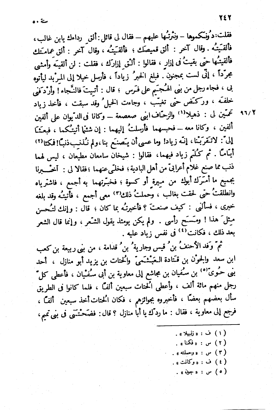 فقلت: دونكموها- ونثرتها عَلَيْهِم- فَقَالَ لي قائل: الق رداءك يا بن غالب، فألقيته وَقَالَ آخر: ألق قميصك، فألقيته، وقال آخر: الق عمامتك فألقيتها حَتَّى بقيت فِي إزار، فَقَالُوا: ألق إزارك، فقلت: لن ألقيه وأمشي مجردا، إني لست بمجنون فبلغ الخبر زيادا، فأرسل خيلا إِلَى المربد ليأتوه بي، فَجَاءَ رجل من بني الهجيم عَلَى فرس، قَالَ: أتيت فالنجاء! وأردفني خلفه، وركض حَتَّى تغيب، وجاءت الخيل وَقَدْ سبقت، فأخذ زياد عمين لي: ذهيلا والزحاف ابني صعصعة- وكانا فِي الديوان عَلَى ألفين ألفين، وكانا مَعَهُ- فحبسهما فأرسلت إليهما: إن شئتما أتيتكما، فبعثا إلي: لا تقربنا، إنه زياد! وما عسى أن يصنع بنا، ولم نذنب ذنبا! فمكثا أياما ثُمَّ كلم زياد فيهما، فَقَالُوا: شيخان سامعان مطيعان، ليس لهما ذنب مما صنع غلام أعرابي من أهل البادية، فخلي عنهما، فقالا لي: أَخْبَرَنَا بجميع مَا أمرك أبوك من ميرة أو كسوة، فخبرتهما بِهِ أجمع، فاشترياه وانطلقت حَتَّى لحقت بغالب، وحملت ذَلِكَ معي أجمع، فأتيته وَقَدْ بلغه خبري، فسألني: كيف صنعت؟ فأخبرته بِمَا كَانَ، قَالَ: وإنك لتحسن مثل هَذَا! ومسح رأسي ولم يكن يَوْمَئِذٍ يقول الشعر، وإنما قَالَ الشعر بعد ذَلِكَ، فكانت فِي نفس زياد عَلَيْهِ.