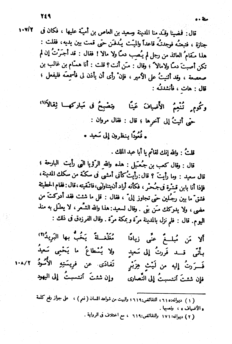 قَالَ: وَقَالَ كعب بن جعيل: هَذِهِ وَاللَّهِ الرؤيا الَّتِي رأيت البارحة، قَالَ سَعِيد: وما رأيت؟ قَالَ: رأيت كأني أمشي فِي سكة من سكك المدينة، فإذا انا بابن قتره فِي جحر، فكأنه أراد أن يتناولني، فاتقيته، قَالَ: فقام الحطيئة فشق مَا بين رجلين حَتَّى تجاوز إلي، فَقَالَ: قل مَا شئت فقد أدركت من مضى، وَلا يدركك من بقي وَقَالَ لسعيد: هَذَا وَاللَّهِ الشعر، لا يعلل بِهِ منذ الْيَوْم قَالَ: فلم نزل بِالْمَدِينَةِ مرة وبمكة مرة وَقَالَ الفرزدق فِي ذَلِكَ: