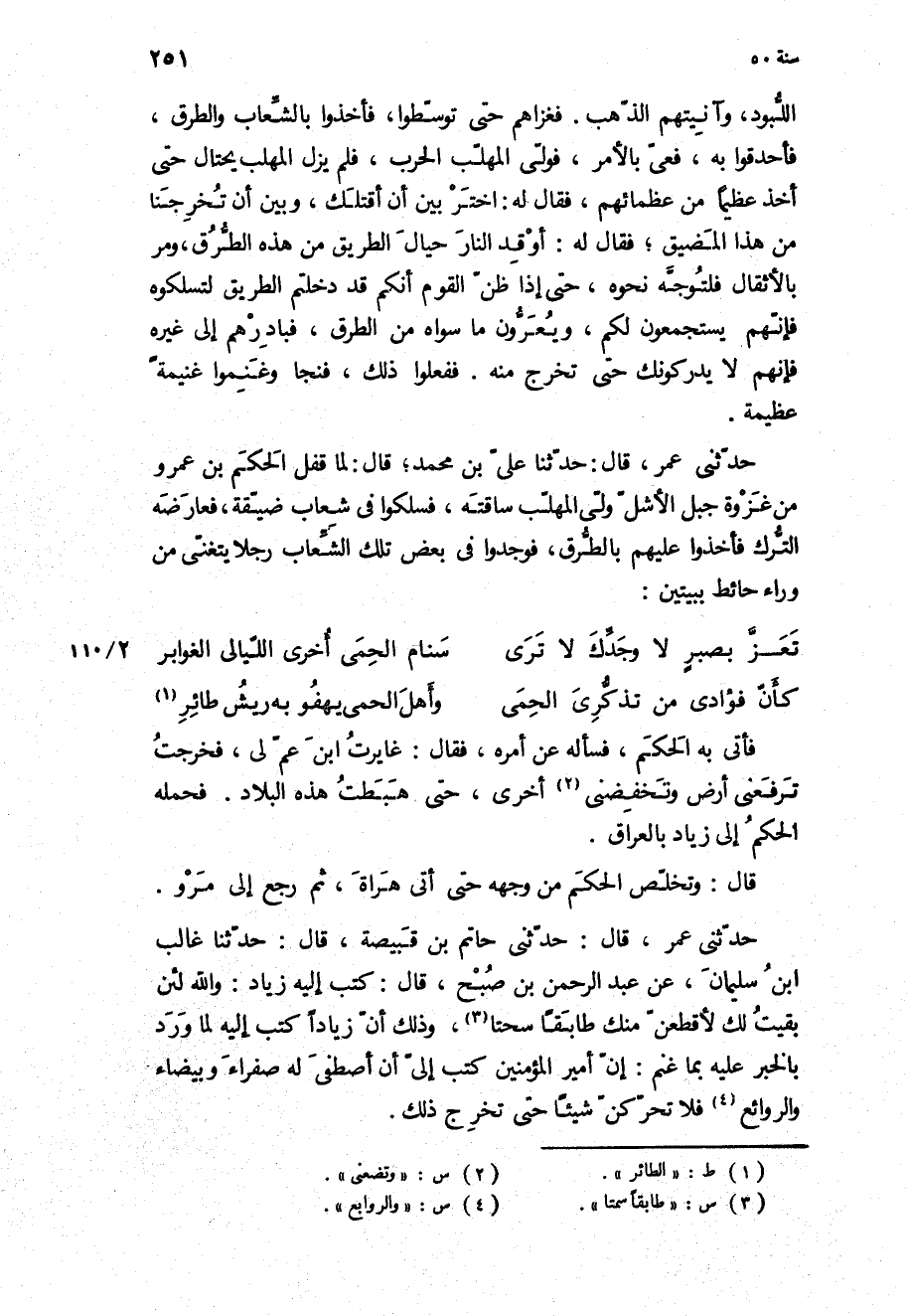 حَدَّثَنِي عُمَرُ، قَالَ: حَدَّثَنَا عَلِيُّ بْنُ مُحَمَّدٍ، قَالَ: لما قفل الحكم بن عَمْرو من غزوة جبل الأشل ولي المهلب ساقته، فسلكوا فِي شعاب ضيقة، فعارضه الترك فأخذوا عَلَيْهِم بالطرق، فوجدوا فِي بعض تِلَكَ الشعاب رجلا يتغنى من وراء حائط ببيتين: