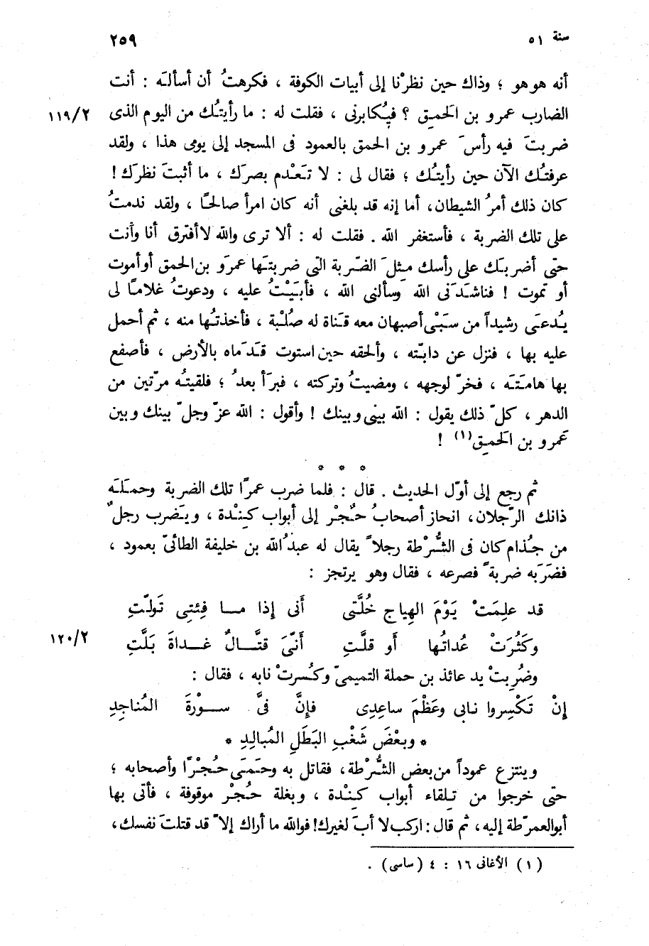 أنه هُوَ هُوَ، وذاك حين نظرنا إِلَى أبيات الْكُوفَة، فكرهت أن أسأله: أنت الضارب عَمْرو بن الحمق؟ فيكابرني، فقلت لَهُ: مَا رأيتك من الْيَوْم الَّذِي ضربت فِيهِ رأس عَمْرو بن الحمق بالعمود فِي المسجد إِلَى يومي هَذَا، وَلَقَدْ عرفتك الآن حين رأيتك، فَقَالَ لي: لا تعدم بصرك، مَا أثبت نظرك! كَانَ ذَلِكَ أمر الشَّيْطَان، أما إنه قَدْ بلغني أنه كَانَ امرأ صالحا، وَلَقَدْ ندمت عَلَى تِلَكَ الضربة، فأستغفر اللَّه فقلت له: الا ترى وَاللَّهِ لا أفترق أنا وأنت حَتَّى أضربك عَلَى رأسك مثل الضربة الَّتِي ضربتها عَمْرو بن الحمق أو أموت أو تموت! فناشدني اللَّه وسألني اللَّه، فأبيت عَلَيْهِ، ودعوت غلاما لي يدعى رشيدا من سبي أصبهان مَعَهُ قناة لَهُ صلبة، فأخذتها مِنْهُ، ثُمَّ أحمل عَلَيْهِ بِهَا، فنزل عن دابته، وألحقه حين استوت قدماه بالأرض، فأصفع بِهَا هامته، فخر لوجهه، ومضيت وتركته، فبرأ بعد، فلقيته مرتين من الدهر، كل ذَلِكَ يقول: اللَّه بيني وبينك! وأقول: اللَّه عَزَّ وَجَلَّ بينك وبين عَمْرو بن الحمق! ثُمَّ رجع إِلَى أول الحديث قَالَ: فلما ضرب عمرا تِلَكَ الضربة وحمله ذانك الرجلان، انحاز أَصْحَاب حجر إِلَى أبواب كندة، ويضرب رجل من جذام كَانَ فِي الشرطة رجلا يقال لَهُ عَبْد اللَّهِ بن خليفة الطَّائِيّ بعمود، فضربه ضربة فصرعه، فَقَالَ وَهُوَ يرتجز: