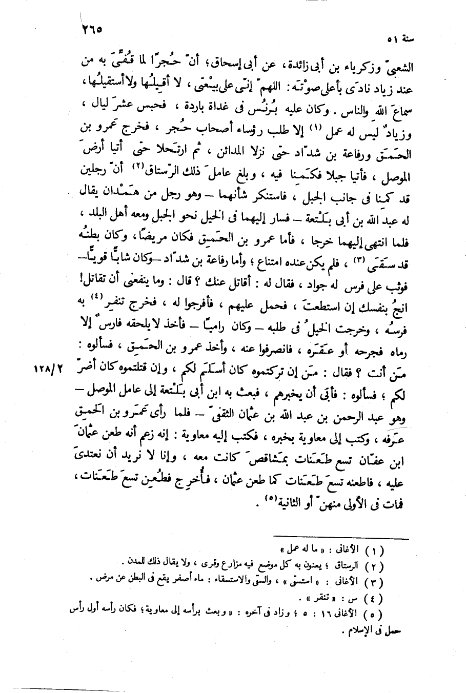 الشَّعْبِيِّ وزكرياء بن أبي زائدة، عن أبي إِسْحَاق، أن حجرا لما قفي بِهِ من عِنْدَ زياد نادى بأعلى صوته: اللَّهُمَّ إني عَلَى بيعتي، لا أقيلها وَلا أستقيلها، سماع اللَّه والناس وَكَانَ عَلَيْهِ برنس فِي غداة باردة، فحبس عشر ليال، وزياد ليس لَهُ عمل إلا طلب رؤساء أَصْحَاب حجر، فخرج عَمْرو بن الحمق ورفاعة بن شداد حَتَّى نزلا المدائن، ثُمَّ ارتحلا حَتَّى أتيا أرض الموصل، فأتيا جبلا فكمنا فِيهِ، وبلغ عامل ذَلِكَ الرستاق أن رجلين قَدْ كمنا فِي جانب الجبل، فاستنكر شأنهما- وَهُوَ رجل من همدان يقال لَهُ عَبْد اللَّهِ بن أبي بلتعة- فسار إليهما فِي الخيل نحو الجبل وَمَعَهُ أهل البلد، فلما انتهى إليهما خرجا، فأما عَمْرو بن الحمق فكان مريضا، وَكَانَ بطنه قَدْ سقى، فلم يكن عنده امتناع، وأما رفاعة بن شداد- وَكَانَ شابا قويا- فوثب عَلَى فرس لَهُ جواد، فَقَالَ لَهُ: أقاتل عنك؟ قَالَ: وما ينفعني أن تقاتل! انج بنفسك إن استطعت، فحمل عَلَيْهِم، فأفرجوا لَهُ، فخرج تنفر بِهِ فرسه، وخرجت الخيل فِي طلبه- وَكَانَ راميا- فأخذ لا يلحقه فارس إلا رماه فجرحه أو عقره، فانصرفوا عنه، وأخذ عَمْرو بن الحمق، فسألوه: