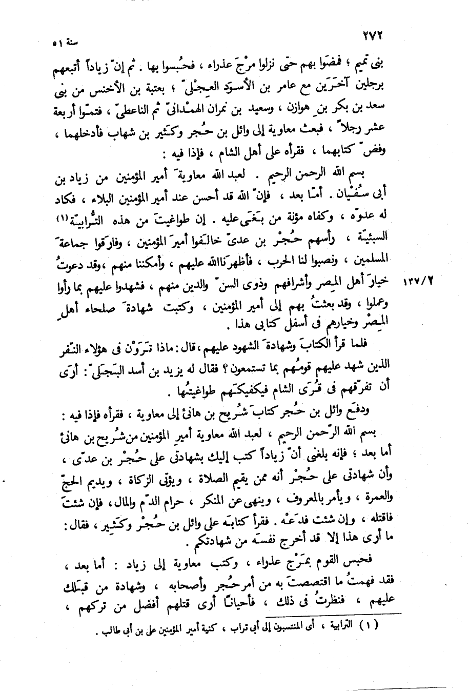 بني تميم، فمضوا بهم حَتَّى نزلوا مرج عذراء، فحبسوا بها ثم ان زيادا أتبعهم برجلين آخرين مع عَامِر بن الأَسْوَدِ العجلي، بعتبة بن الأخنس من بني سعد بن بكر بن هوازن، وسعيد بن نمران الهمداني ثُمَّ الناعطي، فتموا أربعة عشر رجلا، فبعث مُعَاوِيَة إِلَى وائل بن حجر وكثير بن شهاب فأدخلهما، وفض كتابهما، فقرأه عَلَى أهل الشام، فإذا فِيهِ: