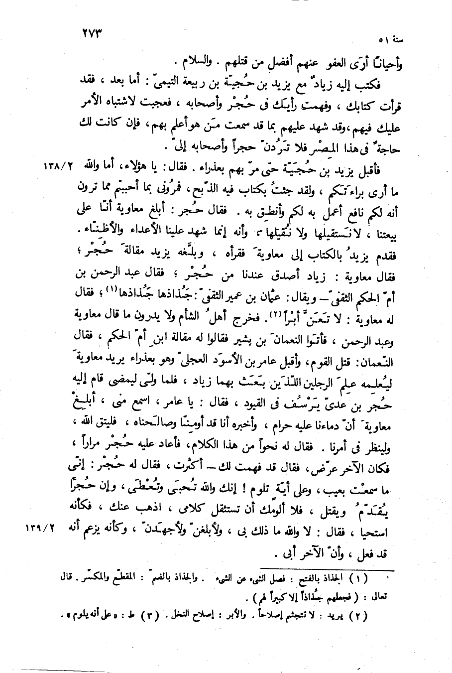 فقدم يَزِيد بالكتاب إِلَى مُعَاوِيَةَ فقرأه، وبلغه يَزِيد مقالة حجر، فَقَالَ مُعَاوِيَة: زياد أصدق عندنا من حجر، فَقَالَ عَبْدُ الرَّحْمَنِ بن أم الحكم الثقفي- ويقال: عُثْمَان بن عمير الثقفي: جذاذها جذاذها، فَقَالَ لَهُ مُعَاوِيَة: لا تعن أبرا فخرج أهل الشام وَلا يدرون مَا قَالَ مُعَاوِيَة وعبد الرَّحْمَن، فأتوا النُّعْمَان بن بشير فَقَالُوا لَهُ مقالة ابن أم الحكم، فَقَالَ النُّعْمَان: قتل القوم، وأقبل عَامِر بن الأَسْوَدِ العجلي وَهُوَ بعذراء يريد مُعَاوِيَة ليعلمه علم الرجلين اللذين بعث بهما زياد، فلما ولى ليمضي قام إِلَيْهِ حجر بن عدي يرسف فِي القيود، فَقَالَ: يَا عَامِر، اسمع مني، أبلغ مُعَاوِيَة أن دماءنا عَلَيْهِ حرام، وأخبره أنا قَدْ أومنا وصالحناه، فليتق اللَّه، ولينظر فِي أمرنا فَقَالَ لَهُ نحوا من هَذَا الكلام، فأعاد عَلَيْهِ حجر مرارا، فكان الآخر عرض، فَقَالَ قَدْ فهمت لك- أكثرت، فَقَالَ لَهُ حجر: إني مَا سمعت بعيب، وعلى أية تلوم! إنك وَاللَّهِ تحبى وتعطى، وأن حجرا يقدم ويقتل، فلا ألومك ان تستقل كلامي، اذهب عنك، فكأنه استحيا، فَقَالَ: لا والله ما ذلك بي، ولابلغن ولا جهدن، وكأنه يزعم أنه قَدْ فعل، وأن الآخر ابى