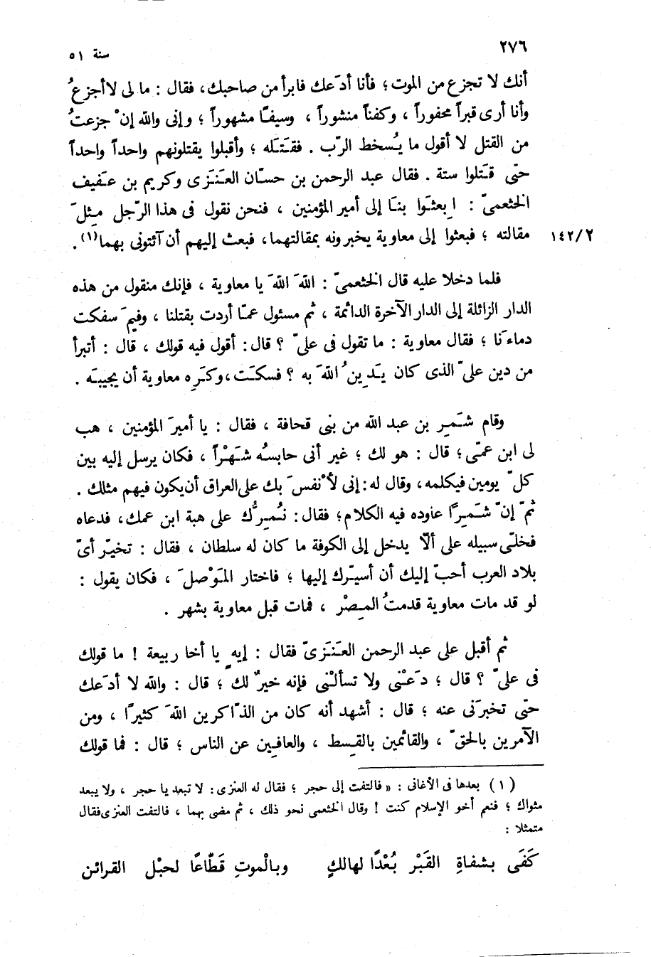 فلما دخلا عَلَيْهِ قَالَ الخثعمي: اللَّه اللَّه يَا مُعَاوِيَة، فإنك منقول من هَذِهِ الدار الزائلة إِلَى الدار الآخرة الدائمة، ثُمَّ مسئول عما أردت بقتلنا، وفيم سفكت دماءنا، فَقَالَ مُعَاوِيَة: مَا تقول فِي علي؟ قَالَ: أقول فِيهِ قولك، قَالَ: أتبرأ من دين علي الَّذِي كَانَ يدين اللَّه بِهِ؟ فسكت، وكره مُعَاوِيَة أن يجيبه وقام شمر بن عَبْدِ اللَّهِ من بني قحافة، فَقَالَ: يَا أَمِيرَ الْمُؤْمِنِينَ، هب لي ابن عمي، قَالَ: هُوَ لك، غير أني حابسه شهرا، فكان يرسل إِلَيْهِ بين كل يومين فيكلمه، وَقَالَ لَهُ: إني لأنفس بك عَلَى العراق أن يكون فِيهِمْ مثلك.
