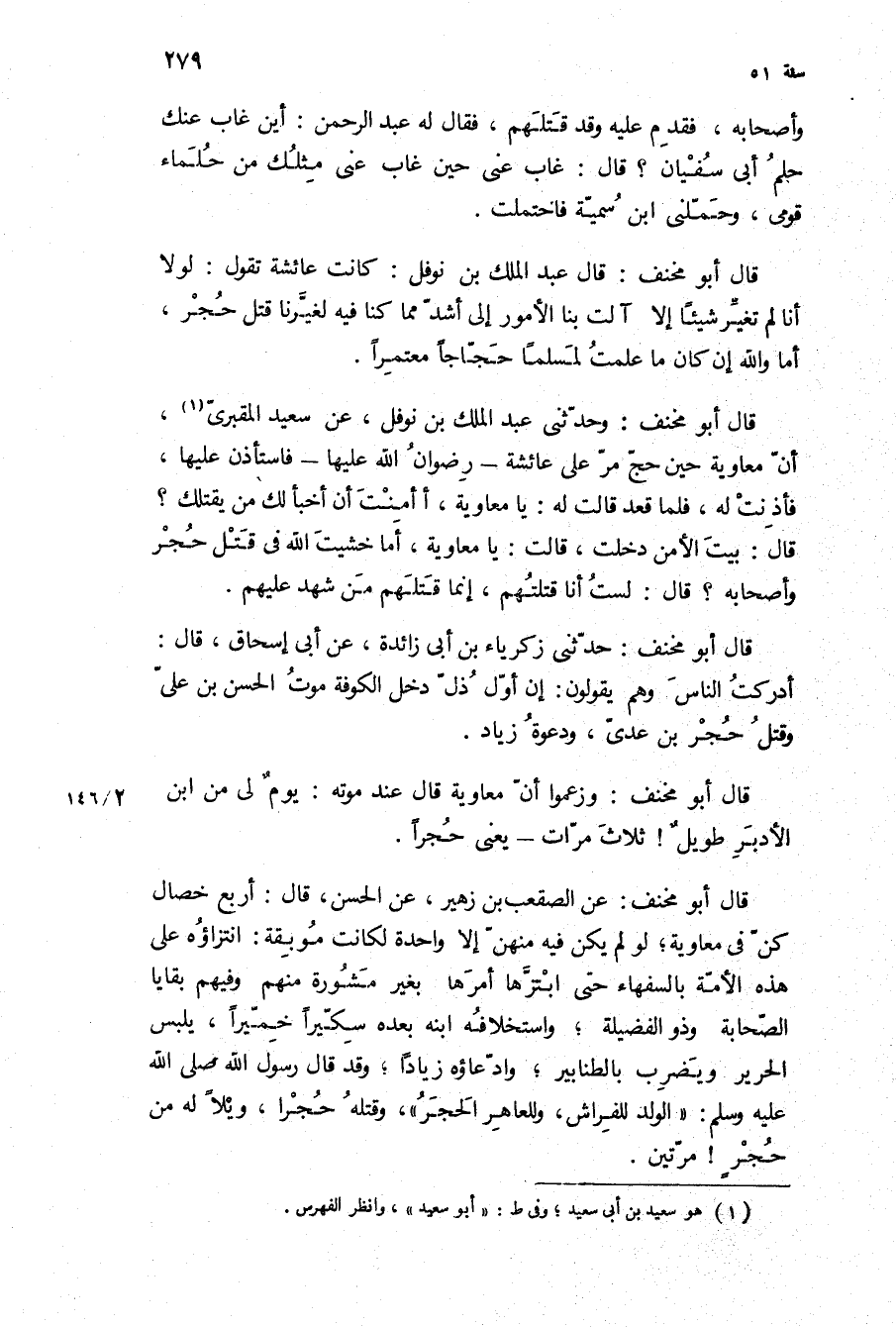 قَالَ أَبُو مخنف: قَالَ عَبْد الْمَلِكِ بن نوفل: كَانَتْ عَائِشَة تقول: لولا أنا لم تغير شَيْئًا إلا آلت بنا الأمور إِلَى أشد مما كنا فِيهِ لغيرنا قتل حجر، أما وَاللَّهِ إن كَانَ مَا علمت لمسلما حجاجا معتمرا قَالَ أَبُو مخنف: وَحَدَّثَنِي عَبْد الْمَلِكِ بن نوفل، عن سَعِيد المقبري، أن مُعَاوِيَة حين حج مر عَلَى عَائِشَة- رضوان اللَّه عَلَيْهَا- فاستأذن عَلَيْهَا، فأذنت لَهُ، فلما قعد قالت لَهُ: يَا مُعَاوِيَة، أأمنت أن أخبأ لك من يقتلك؟