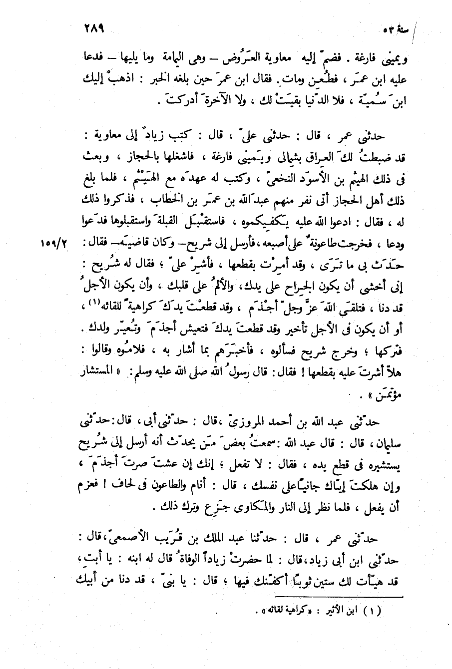 حَدَّثَنِي عَبْدُ اللَّهِ بْنُ أَحْمَدَ المروزي، قَالَ: حدثني أبي، قال: حدثني سُلَيْمَان، قَالَ: قَالَ عَبْدُ اللَّهِ: سَمِعْتُ بَعْضَ مَنْ يُحَدِّثُ أَنَّهُ أَرْسَلَ إِلَى شُرَيْحٍ يَسْتَشِيرُهُ فِي قَطْعِ يَدِهِ، فَقَالَ: لا تَفْعَلْ، إِنَّكَ إِنْ عِشْتَ صِرْتَ أَجْذَمَ، وَإِنْ هَلَكْتَ إِيَّاكَ جَانِيًا عَلَى نَفْسِكَ، قَالَ: أَنَامُ وَالطَّاعُونَ فِي لِحَافٍ! فَعَزَمَ أَنْ يَفْعَلَ، فَلَمَّا نَظَرَ إِلَى النَّارِ وَالْمَكَاوِي جَزِعَ وَتَرَكَ ذَلِكَ.