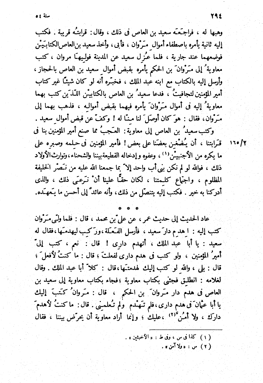 وهبها لَهُ، فراجعه سَعِيد بن الْعَاصِ فِي ذَلِكَ، وَقَالَ: قرابته قريبة فكتب إِلَيْهِ ثانية يأمره باصطفاء أموال مَرْوَان، فأبى، وأخذ سَعِيد بن الْعَاصِ الكتابين فوضعهما عِنْدَ جارية، فلما عزل سَعِيد عن الْمَدِينَة فوليها مَرْوَان، كتب مُعَاوِيَة إِلَى مَرْوَان بن الحكم يأمره بقبض اموال سعيد بن العاص بالحجار، وأرسل إِلَيْهِ بالكتاب مع ابنه عَبْد الْمَلِكِ، فخبره أنه لو كَانَ شَيْئًا غير كتاب أَمِير الْمُؤْمِنِينَ لتجافيت، فدعا سَعِيد بن الْعَاصِ بالكتابين اللذين كتب بهما مُعَاوِيَة إِلَيْهِ فِي أموال مَرْوَان يأمره فيهما بقبض أمواله، فذهب بهما إِلَى مَرْوَان، فَقَالَ: هُوَ كَانَ أوصل لنا منا لَهُ! وكف عن قبض أموال سَعِيد.