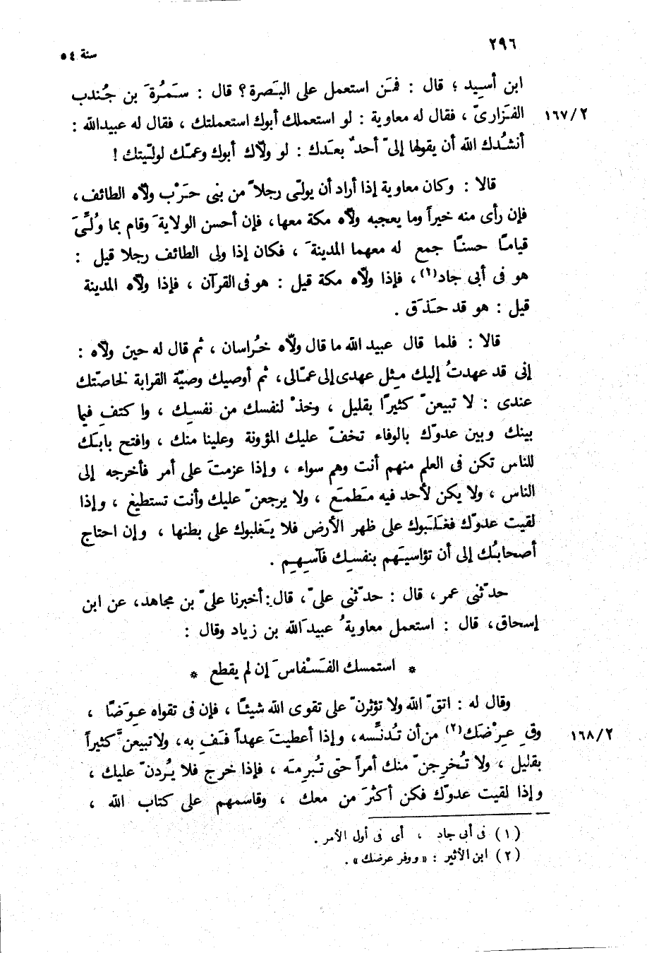 أَنْشُدُكَ اللَّهَ أَنْ يَقُولَهَا إِلَيَّ أَحَدٌ بعدك: لو ولاك ابوك وعمك لوليتك! قالا: وَكَانَ مُعَاوِيَةُ إِذَا أَرَادَ أَنْ يُوَلِّيَ رَجُلا مِنْ بَنِي حَرْبٍ وَلاهُ الطَّائِفَ، فَإِنْ رَأَى منه خيرا وما يُعْجِبُهُ وَلاهُ مَكَّةَ مَعَهَا، فَإِنْ أَحْسَنَ الْوِلايَةَ وَقَامَ بِمَا وُلِّيَ قِيَامًا حَسَنًا جَمَعَ لَهُ مَعَهُمَا الْمَدِينَةَ، فَكَانَ إِذَا وُلِّيَ الطَّائِفُ رَجُلا قِيلَ: